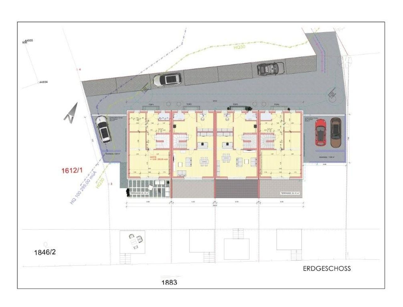 In ruhiger Siedlungslage entlang eines Baches errichten wir ein Reihenhaus mit 4 Einheiten.
