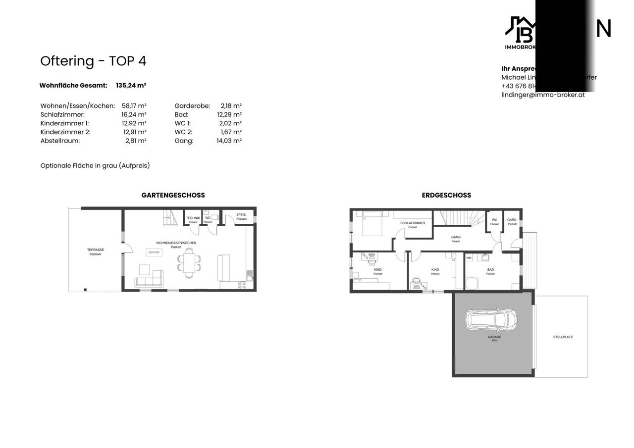 Das Haus überzeugt durch eine zeitgemäße Architektur mit Flachdach, klaren Linien und einem durchdachten Wohnkonzept über zwei Ebenen. Die Erschließung erfolgt über das Erdgeschoss, welches als Schlafebene konzipiert ist. Hier befinden sich das Schlafzimmer, zwei Kinderzimmer, ein Badezimmer mit Fenster, ein separates WC sowie Garderobe und Gangbereich. Über eine innenliegende Treppe gelangt man in das darunterliegende Gartengeschoß, das den großzügigen Wohn-/Ess-/Kochbereich beherbergt. Von hier aus besteht ein direkter Zugang zur Terrasse und in den Garten. Ergänzend sind auf dieser Ebene ein Technikraum, eine Speis sowie ein weiteres WC vorgesehen.
