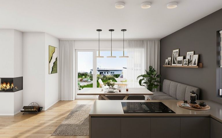 Bei der Planung wurde großer Wert auf die Ausrichtung des Gebäudes und individuelle Wohnbedürfnisse gelegt um alle Vorzüge des eigenen Hauses zu gewährleisten! Mit ausreichend Platz für Ihren persönlichen Freiraum, praktischen Stauraum und moderner Wohnraumplanung wird auf dem Grundstück ein neues Zuhause für Jung und Alt geschaffen. Der Wohn- Koch- Essbereich ermöglicht eine perfekte Balance zwischen Trennung und Verbindung der Bereiche. In der Küche wurde sogar eine Speise berücksichtigt. Ein Kaminanschluss bietet v.a. in der Übergangszeit eine wohlige Alternative zur Wärmepumpe. Sie können den Morgen mit 2 Bäder im Obergeschoss staufrei starten und bei Bedarf im Homeoffice ungestört arbeiten.