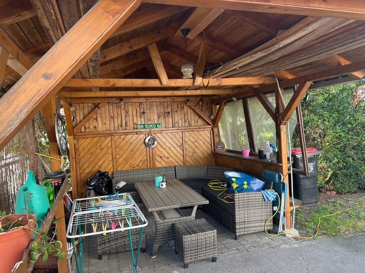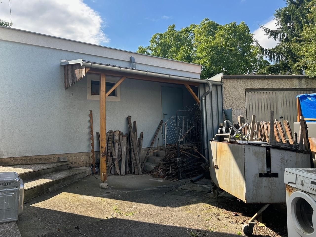 Geheizt wird mit Gas, es gibt eine Garage mit angrenzendem Abstellraum, eine Sitzlaube und einen Garten.