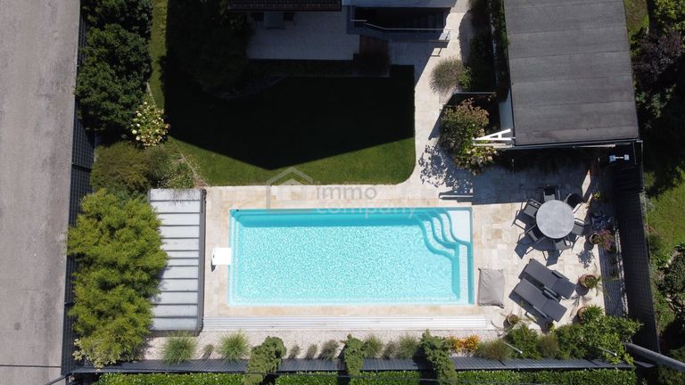 Das 683 m² große Grundstück bietet eine Gartenanlage mit beheiz- und kühlbarem Pool sowie eine Garage. Im ca. 90m² großen Keller stehen Technikräume, eine Waschküche und viel Stauraum zur Verfügung. Die Beheizung erfolgt über eine Gaszentralheizung.
