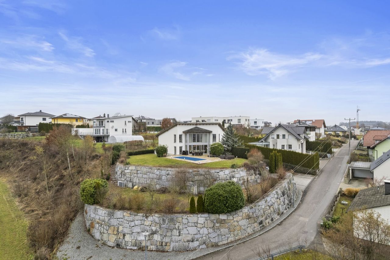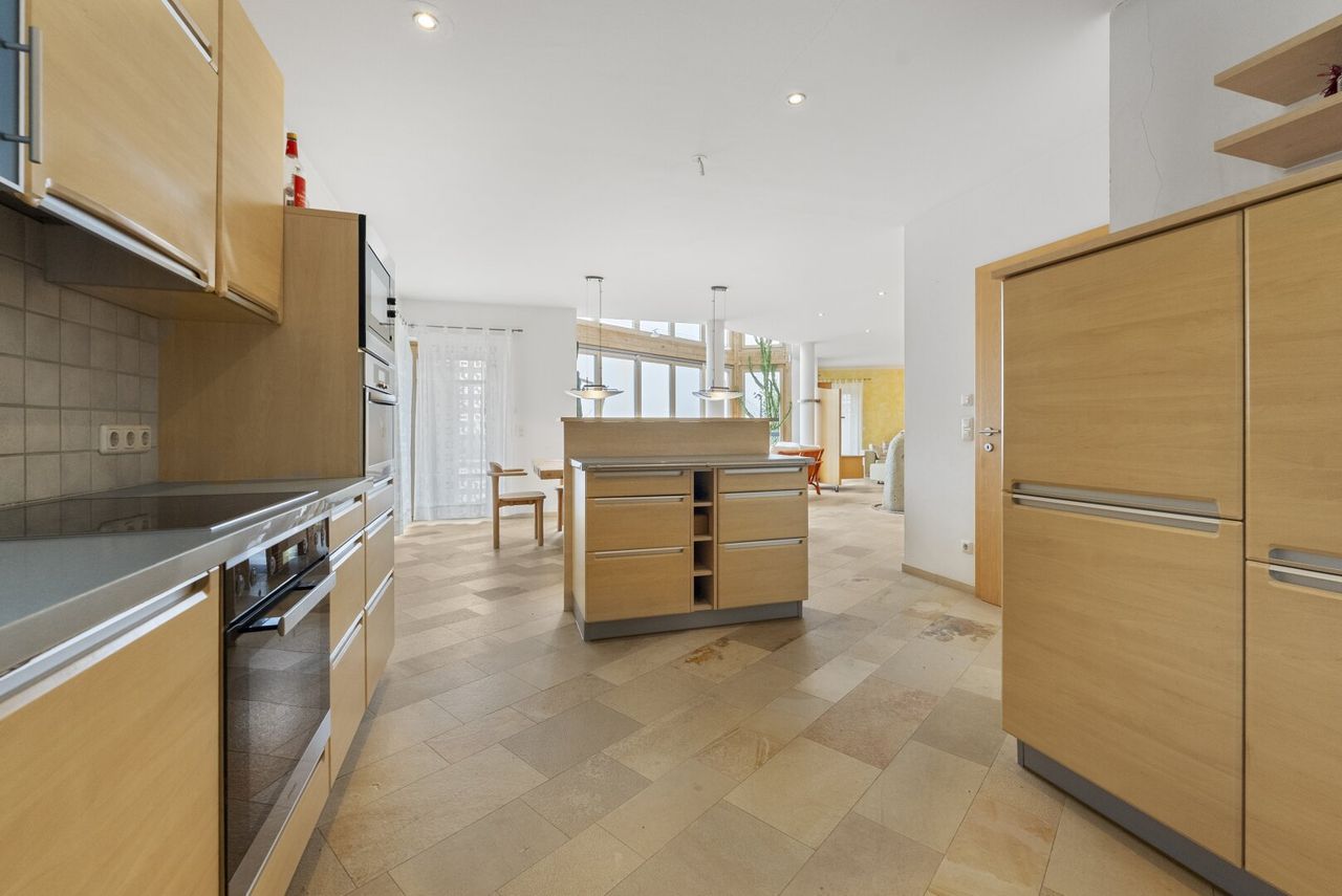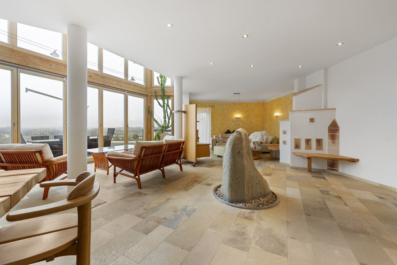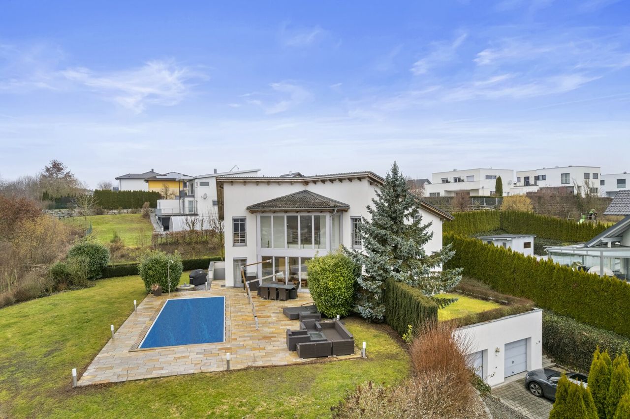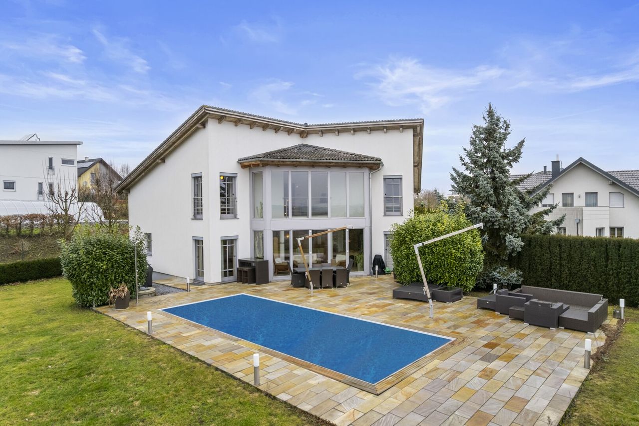 ***Panoramawohnen*** Exklusives Einfamilienhaus in idyllischer Grünlage Direkt im Ortszentrum und zugleich am Beginn einer beschaulichen Einfamilienhaussiedlung befindet sich dieses hochwertig ausgestattete Einfamilienhaus in traumhaft idyllischer Lage. Umgeben von viel Grün genießen Sie hier Ruhe, Privatsphäre und eine besondere Wohnqualität. Die leicht erhöhte Lage des Hauses eröffnet insbesondere vom Wintergarten sowie vom Büro aus einen fantastischen Fernblick, der jeden Tag aufs Neue begeistert. Dank der südlichen Ausrichtung sind die Wohnräume lichtdurchflutet und vermitteln eine helle, freundliche Atmosphäre.