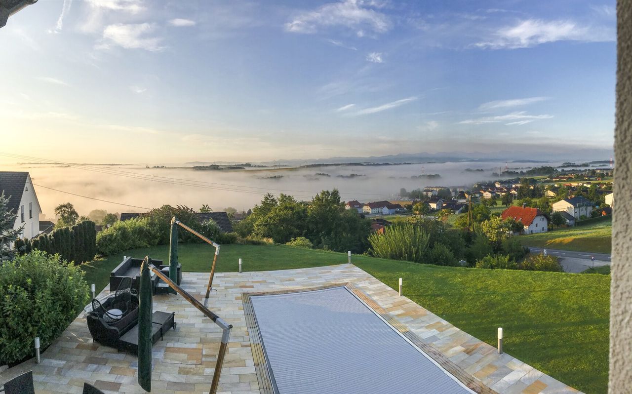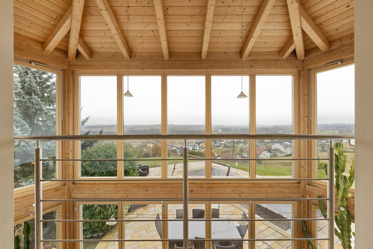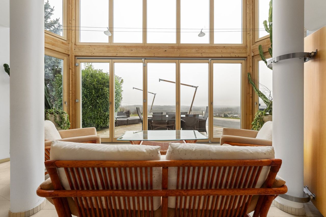 Die leicht erhöhte Lage des Hauses eröffnet insbesondere vom Wintergarten sowie vom Büro aus einen fantastischen Fernblick, der jeden Tag aufs Neue begeistert.