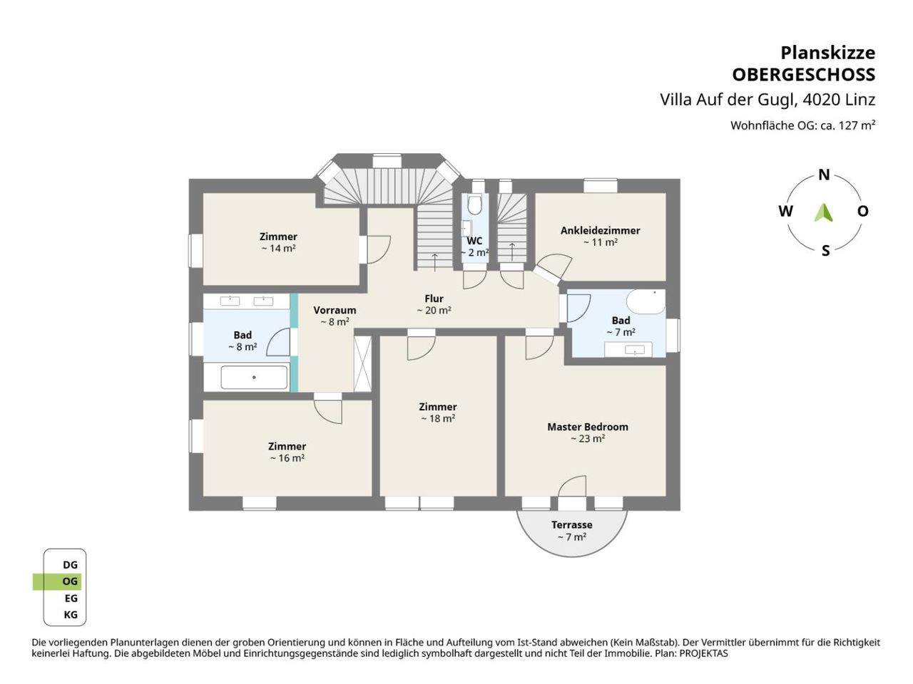 Zusätzlich gibt es im Erdgeschoss eine Terrasse mit ca. 40 m² und im Obergeschoss eine weitere Terrasse mit ca. 7 m².