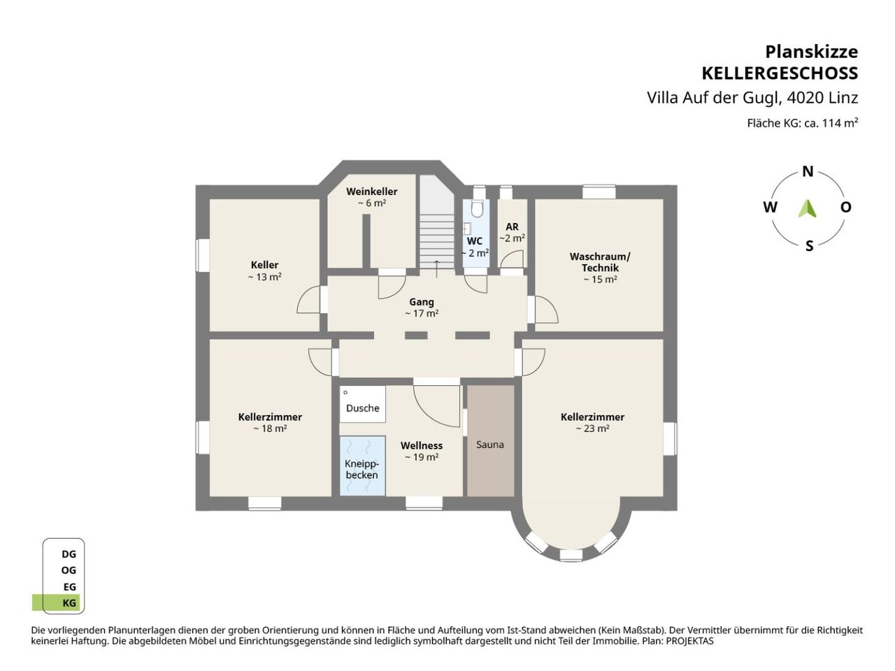 Da das Kellergeschoss auf der Südseite fast zur Gänze freiliegend ist und auch auf der Nordseite die Fenster oberhalb des Terrains angeordnet sind, kann in Verbindung mit der Beheizung der meisten Räume von einem Wohnkeller gesprochen werden.