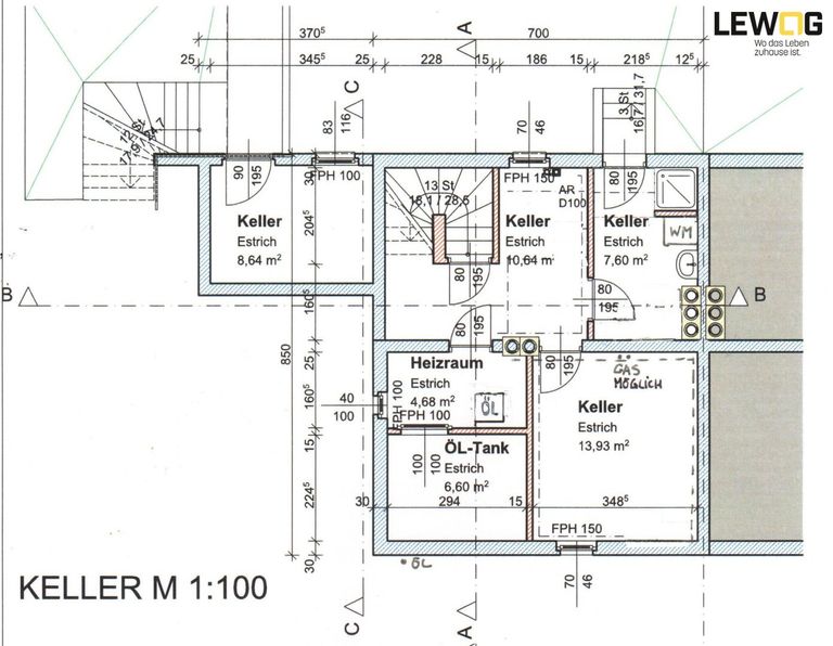 Die Raumaufteilung umfasst im Erdgeschoss einen Windfang, eine separate Küche, ein Wohn-Esszimmer und ein teilsaniertes WC. Im Obergeschoss befinden sich drei Zimmer und ein Bad mit Dusche, Badewanne und WC. Der Keller erstreckt sich unter dem gesamten Gebäude und bietet zusätzlichen Stauraum, weist jedoch noch Sanierungsbedarf auf - er bietet jedoch noch viel Potential.