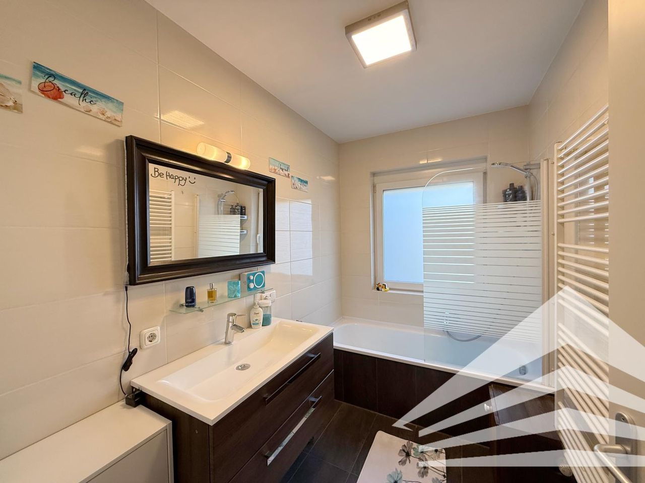 - Zeitgemäßes Bad mit Fenster, Wanne und Handtuchtrockner