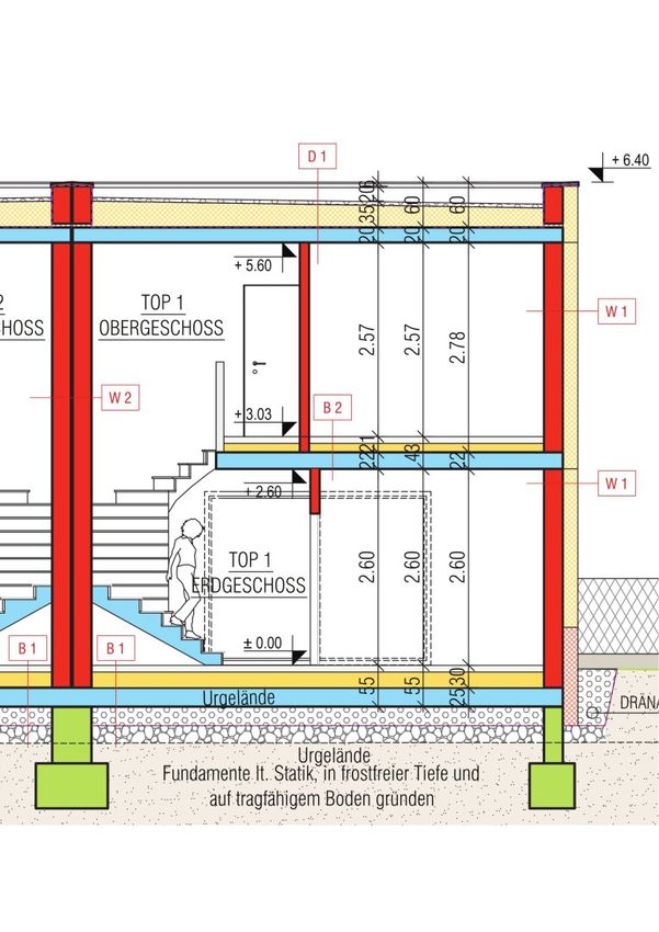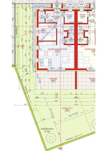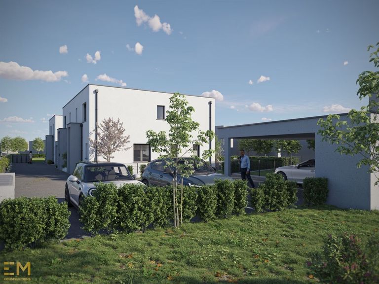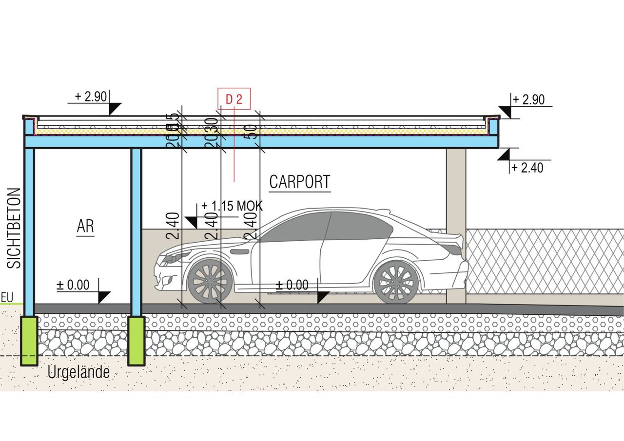 - Der Eingangsbereich, die Carports und die Abtrennung zwischen den Terrassen werden in Beton ausgeführt