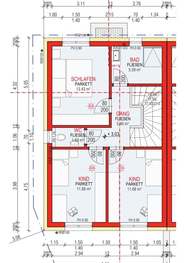- Stiege: Die Trittstufe der Stiege wird mit dem gleichen Parkettboden belegt. Die Setzstufe wird weiß gestrichen.