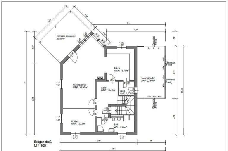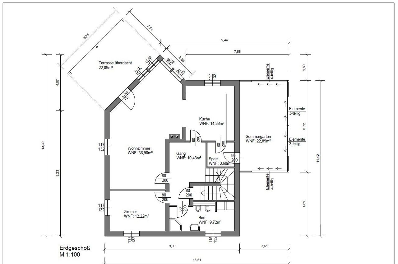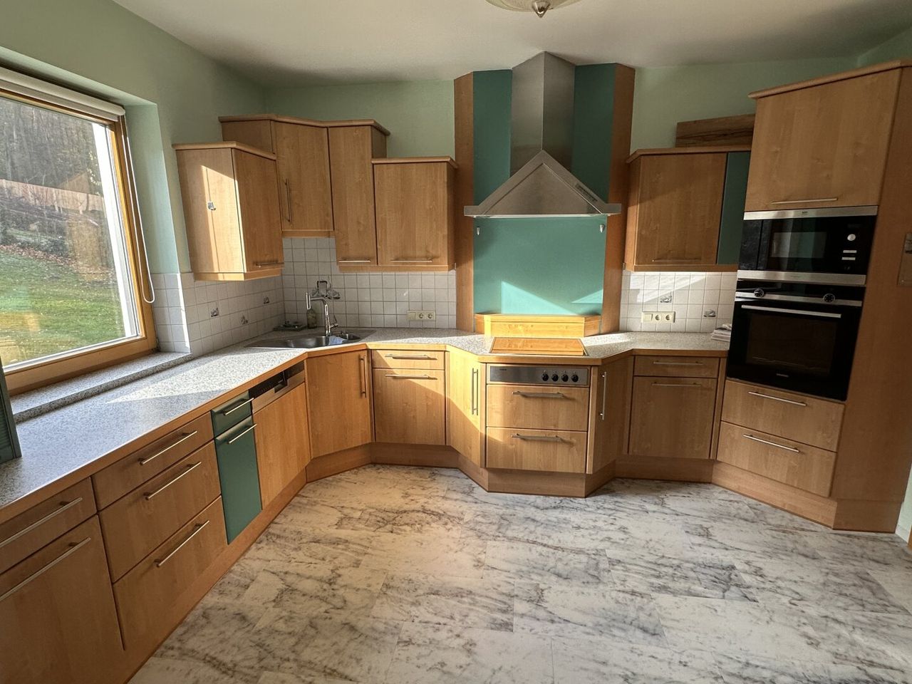 ERDGESCHOSS: Vorraum, möblierte Küche mit Durchgang in den verglasten Sommergarten, großes Wohnzimmer mit Kachelofen und Ausgang auf die überdachte Terrasse, Büro, Bad, WC;