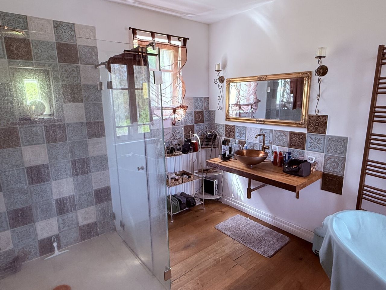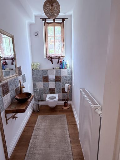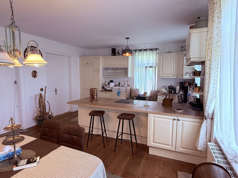 ERDGESCHOSS: großer Vorraum, großer offener Wohnbereich mit schöner Küche, Essplatz und Erker, Schlafzimmer mit Schrankraum, Bad mit Dusche und Wanne, WC,