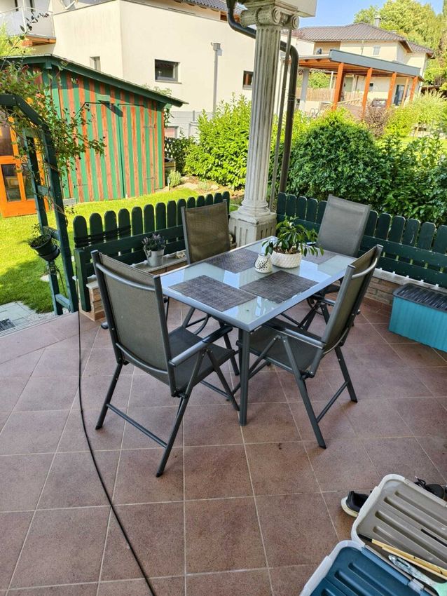 Direkt vom Wohnsalon gelangen Sie auf die schöne, überdachte 21 m² großen Terrasse mit Ausgang in den Garten mit Gartenhaus ( 14 m² groß, inklusive Strom - und Wasseranschluss)