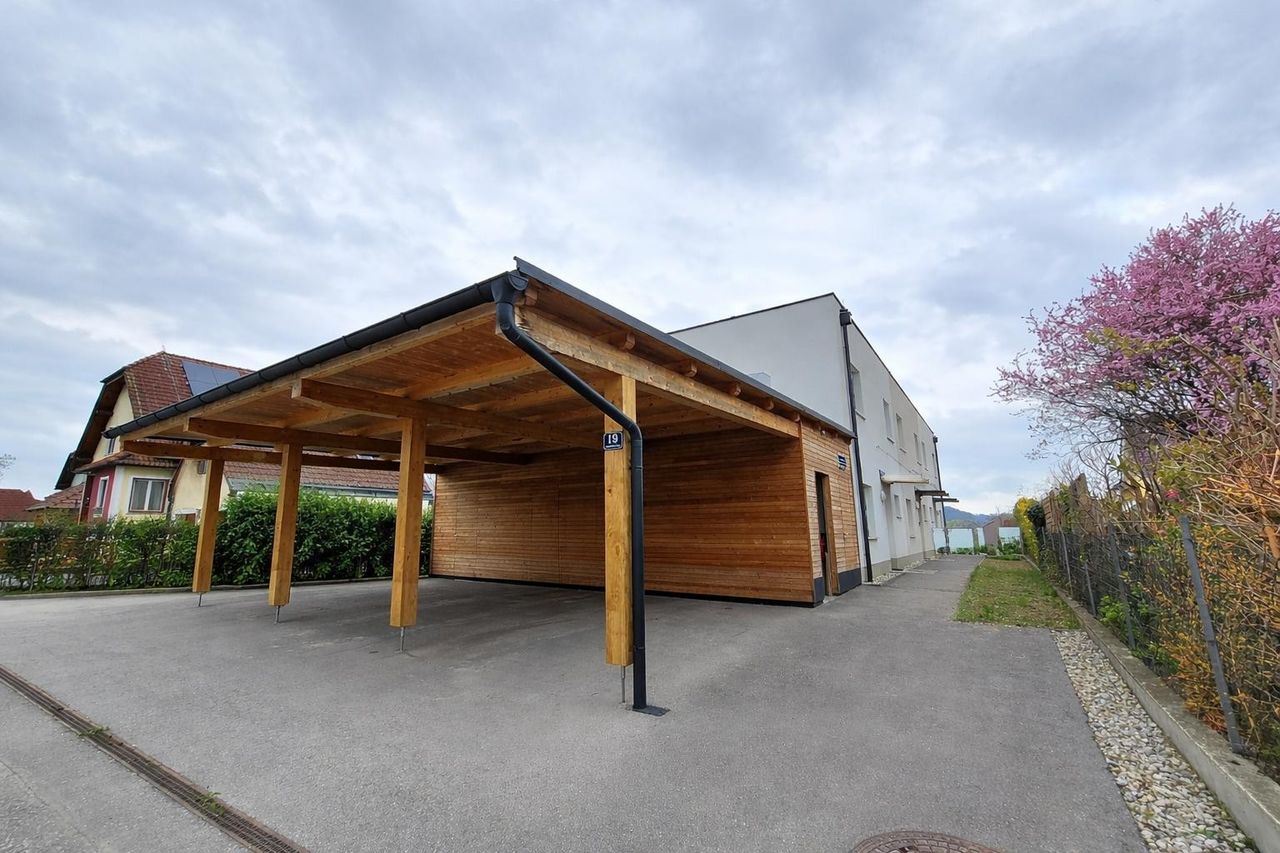 Ein eigener Carport, ein zusätzlicher separater Stellplatz sowie ein großzügiger Abstellraum beim Carport bieten ausreichend Platz für Fahrzeuge, Fahrräder und Stauraum.