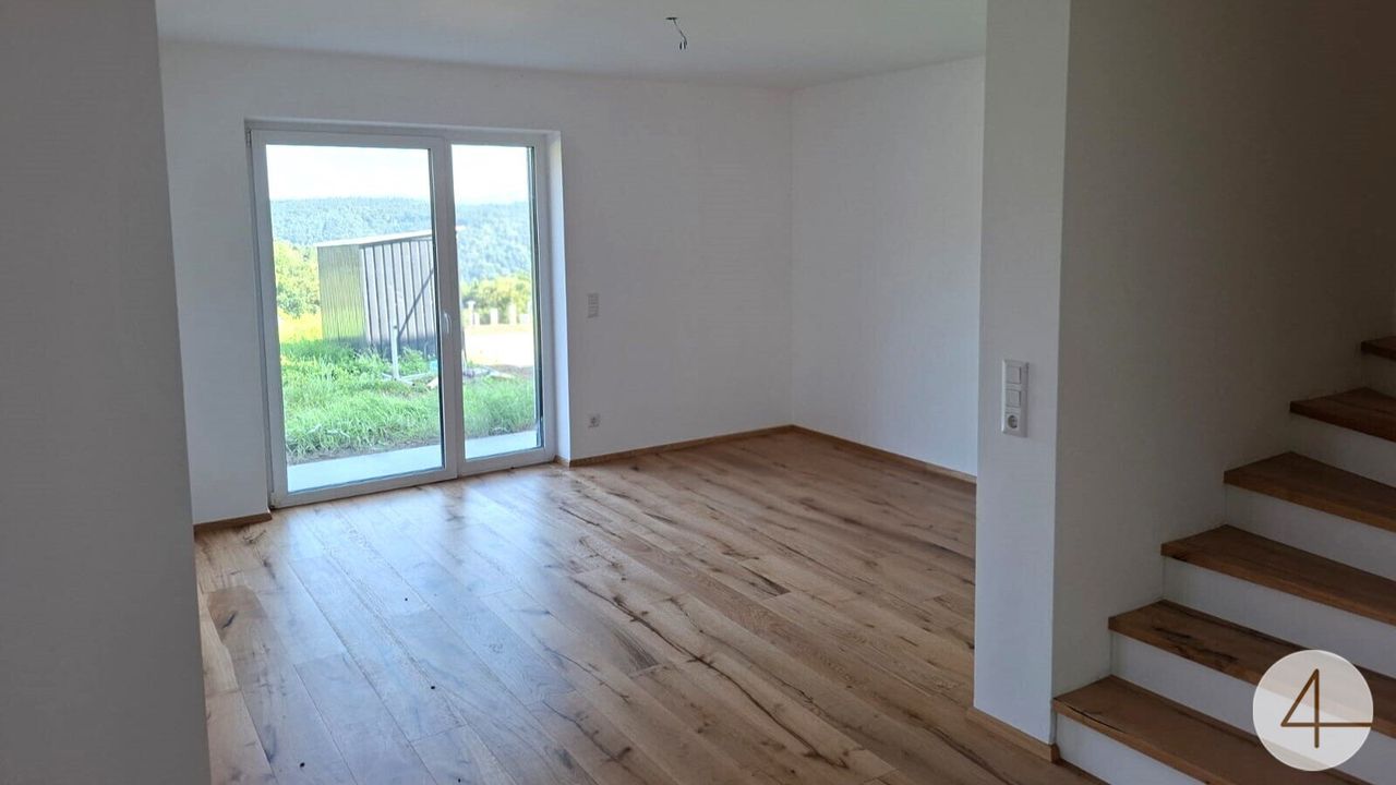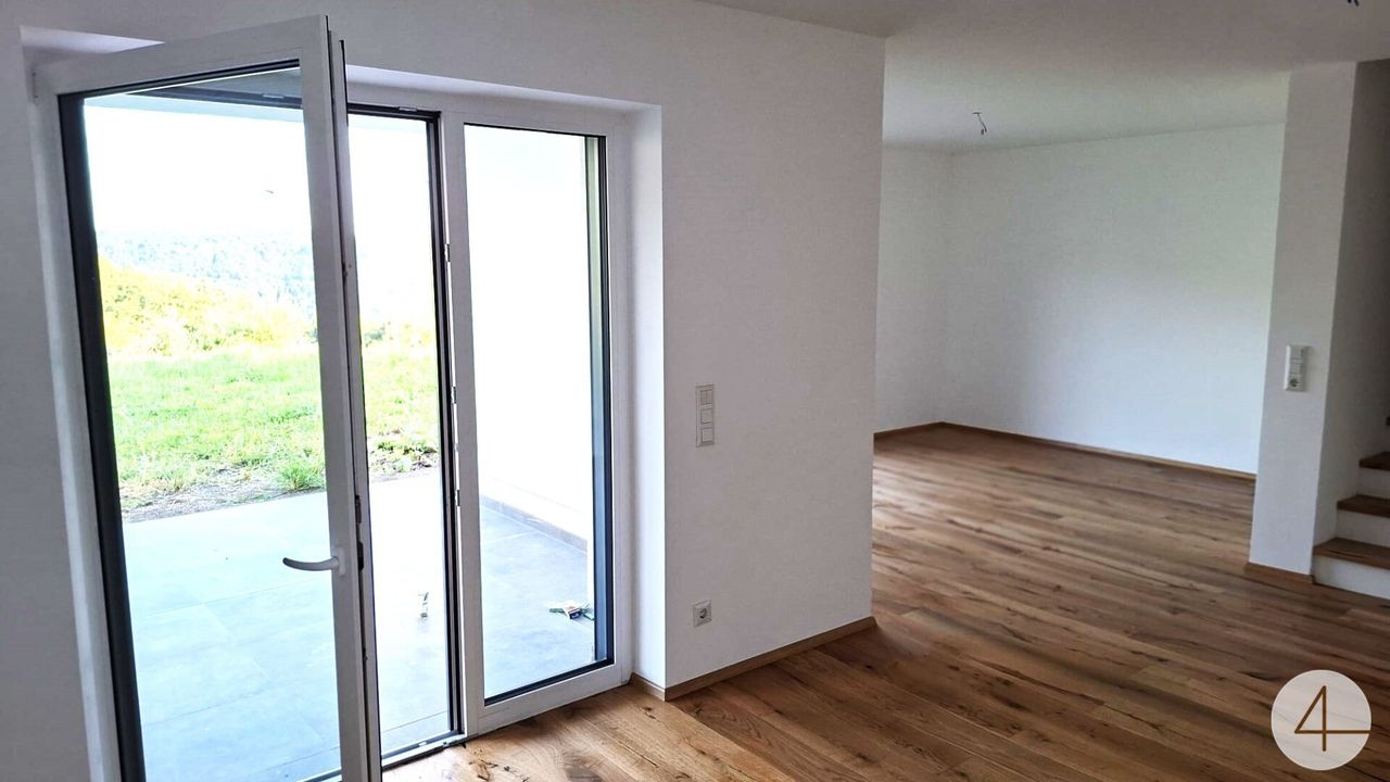 Im Untergeschoss befindet sich der lichtdurchflutete Wohn-, Koch- und Essbereich, der mit direktem Zugang zur Terrasse und dem Eigengarten zum Entspannen im Freien einlädt. Ergänzt wird das Geschoss durch ein Büro, einen Kellerraum, ein weiteres WC mit Dusche sowie den Technikraum.