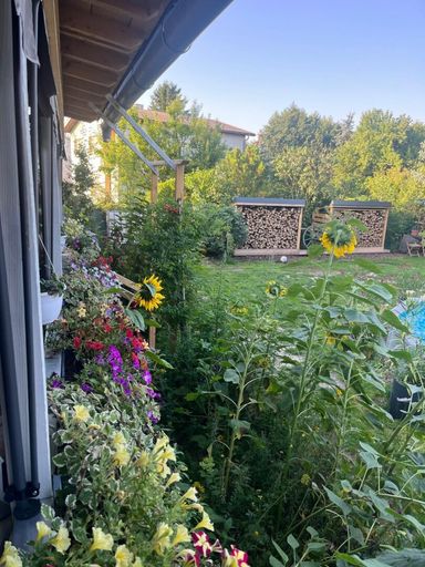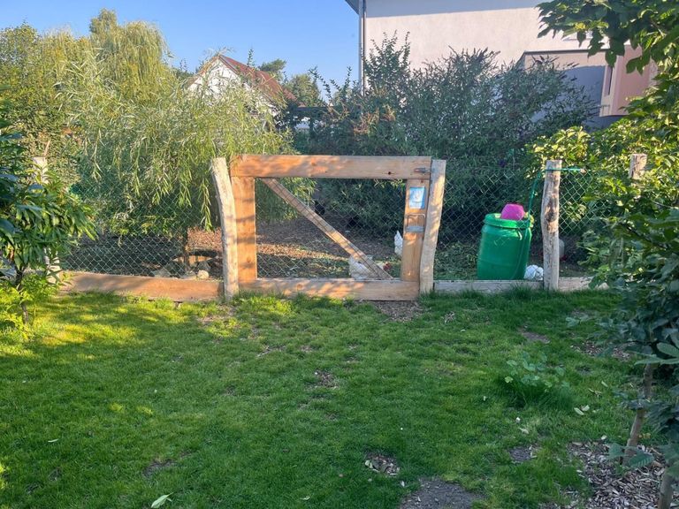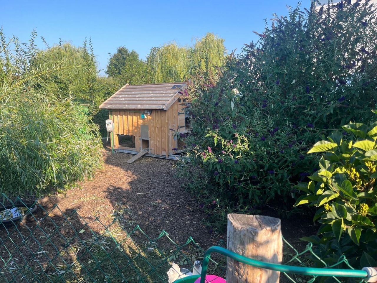 Im hinteren Teil des Gartens ist in einem eigenen Gehege der Hasen- und Hühnerstall untergebracht, ein kleines Bassin erfreut den aktuell hier wohnenden Enterich.