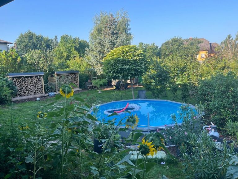 Der Aufstellpool im Garten bietet rasche Abkühlung immer Sommer.