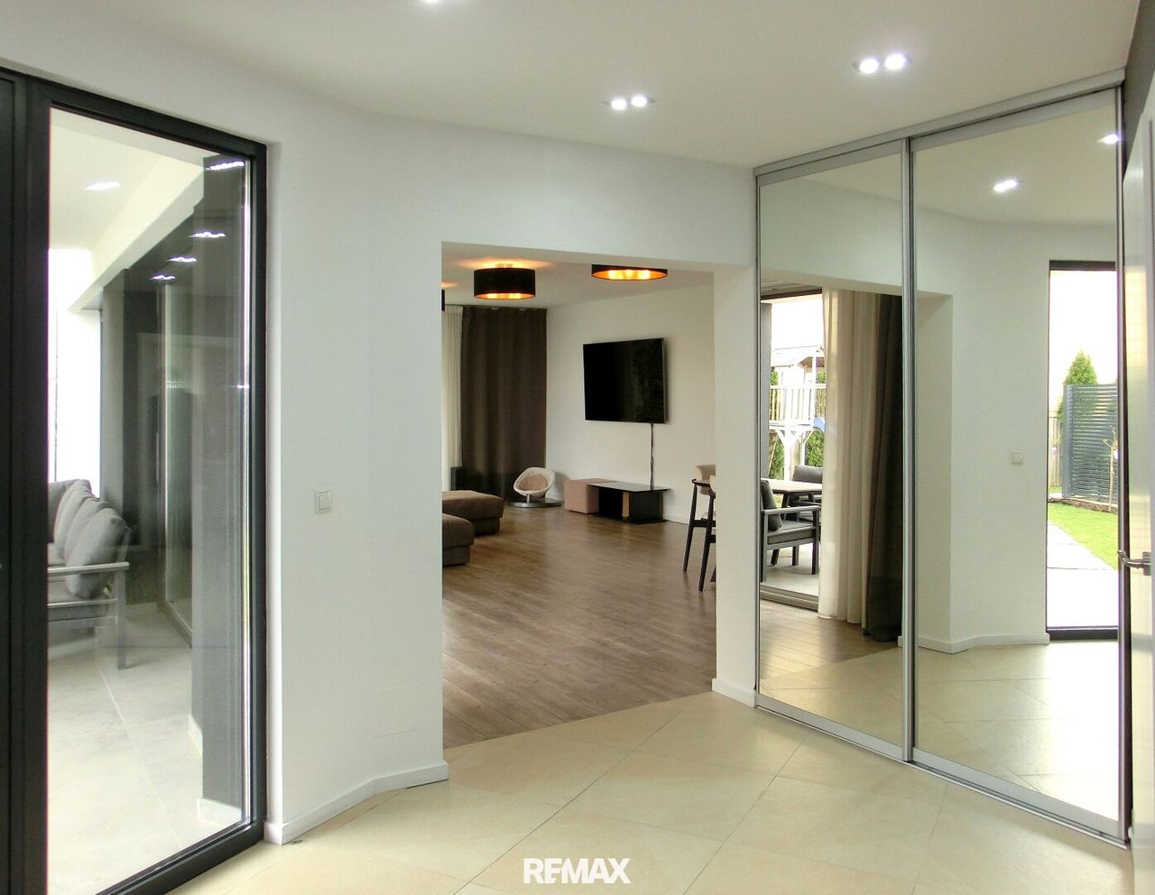 Am Weg zum Haus lassen die Glasfronten bereits Einblicke in den großen Wohnraum vermuten. Nach Ablegen der Garderobe eröffnet sich das Wohnzimmer, die Farben weiß-grau-beige mischen sich in...