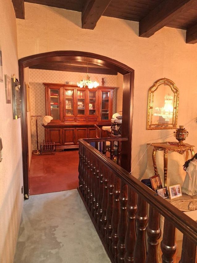 Das Haus ist teilunterkellert und verfügt über insgesamt acht Zimmer, die sich auf zwei Wohneinheiten verteilen. Im Erdgeschoss befinden sich vier Zimmer sowie ein Badezimmer und ein separates WC, im Obergeschoss stehen weitere vier Zimmer und ebenfalls ein Bad mit WC zur Verfügung. Für Fahrzeuge gibt es eine Garage, die Platz für einen PKW bietet.