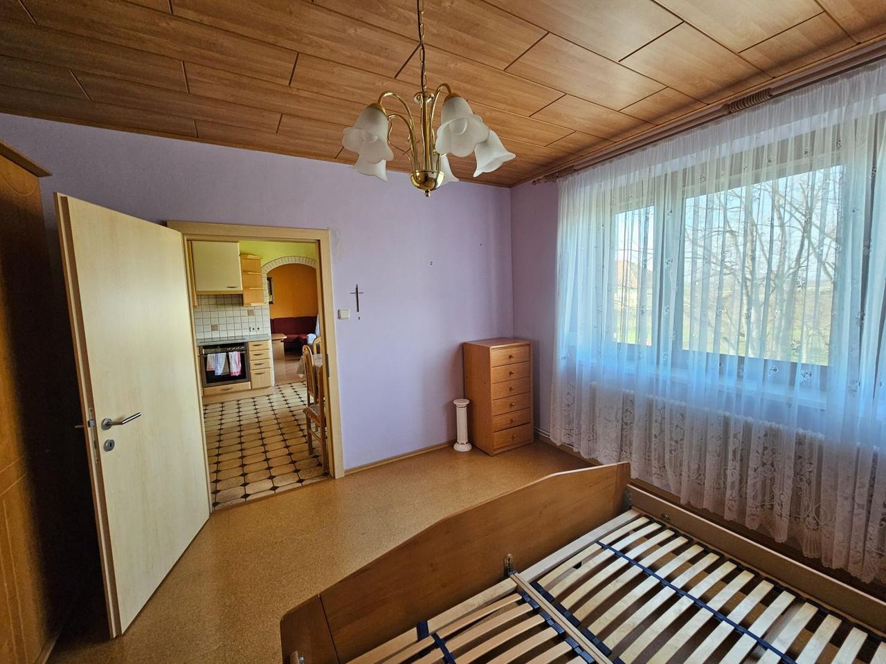 Durch die große Einfahrt kommt man über Stiegen ins Obergeschoß und linkerhand in die untere Wohnung. Sie ist voll ausgestattet mit Küche, Bad/WC mit Dusche und 2 Zimmer.