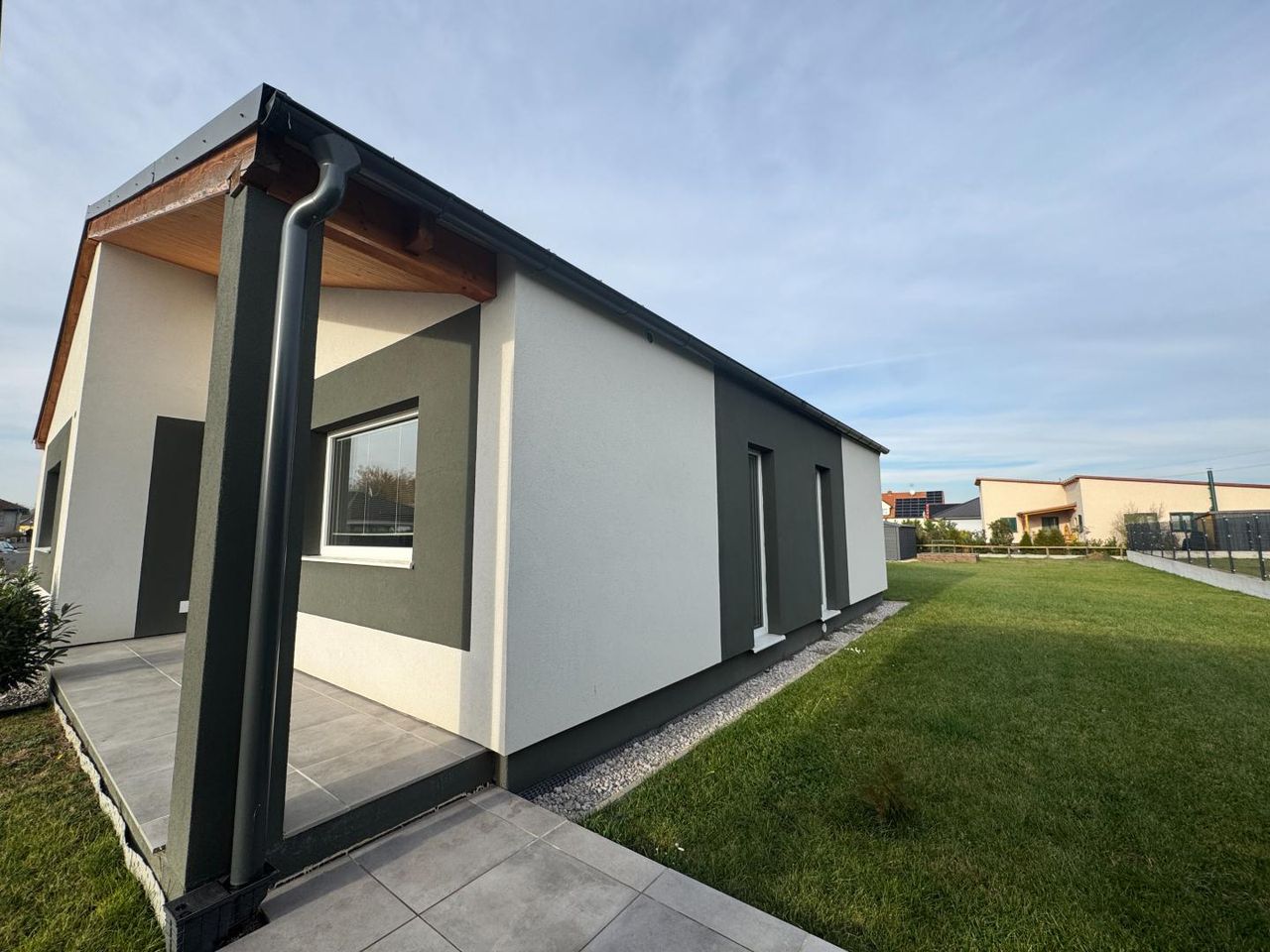 Besonders hervorzuheben ist die überdachte Terrasse auf der Rückseite des Hauses. Sie lädt zu gemütlichen Stunden im Freien ein – ganz gleich, ob beim Frühstück, Grillen oder entspannten Sommerabenden.