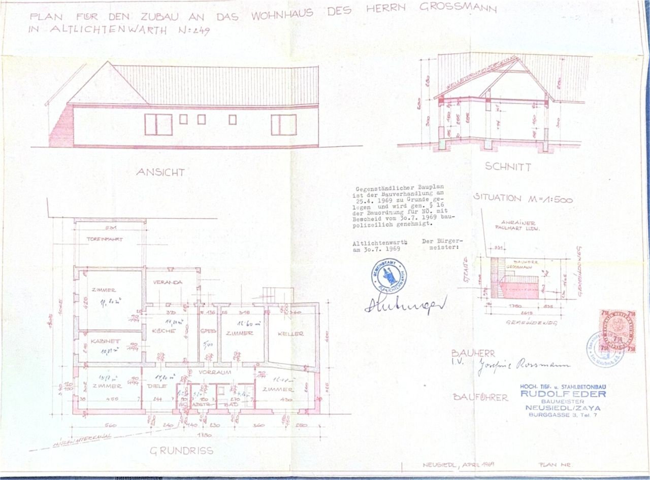 Dieses Einfamilienhaus mit Baujahr ca. 1969 befindet sich in ruhiger Wohnlage in 2144 Altlichtenwarth. Der ursprüngliche Bauplan wurde im Jahr 1952 eingereicht und 1969 erweitert. In den vergangenen Jahrzehnten wurden Anpassungen an der Raumaufteilung vorgenommen, weshalb die bestehenden Räumlichkeiten nicht mehr vollständig dem ursprünglichen Einreichplan entsprechen.