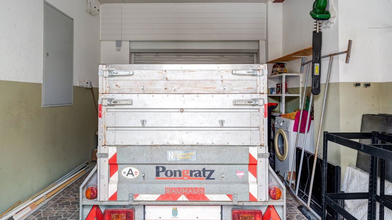 Zum Objekt gehören außerdem eine Veranda, eine Garage mit Garagentor sowie ein Garten mit eigenem Brunnen. Die Garage und die Veranda sind nicht im ursprünglichen Einreichplan enthalten.