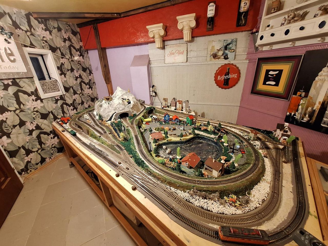 Das Herz eines Modelleisenbahnfans muss hüpfen vor Freude, wenn er in einem Zimmer eine bis ins Detail ausgebaute Modelleisenbahn Anlage sieht. Die ehemalige Garage ist zu einem Arbeitsraum für Heimwerker und einem Holzlager umgebaut.