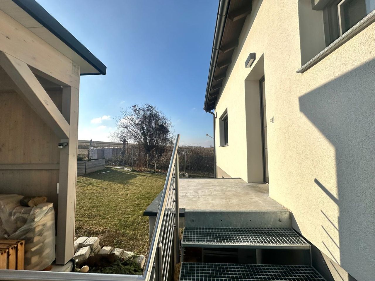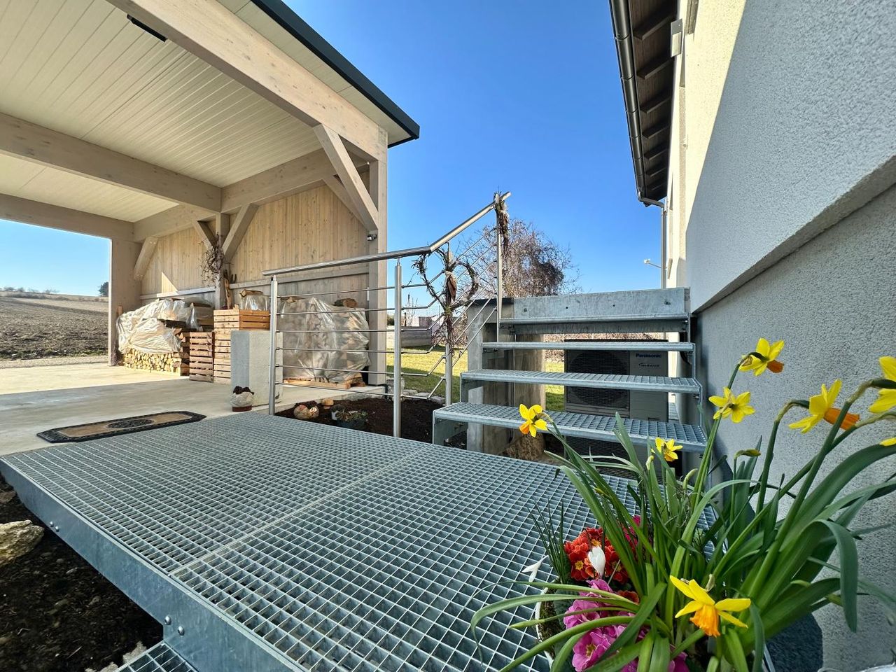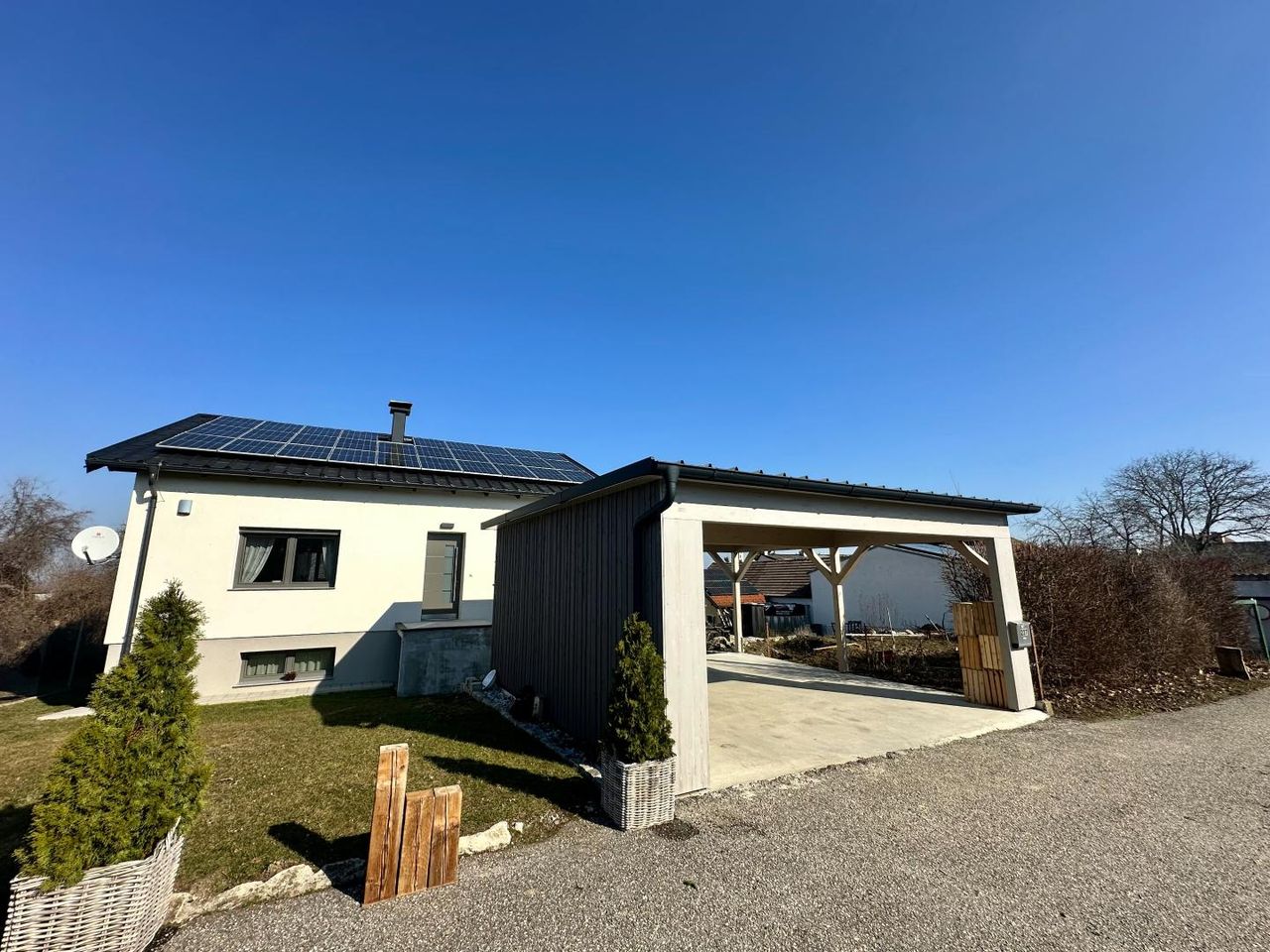 Das Grundstück bietet ein überdachtes Carport sowie einen großzügigen Garten, der nach individuellen Wünschen gestaltet werden kann – sei es als Ruheoase, Familiengarten oder moderner Außenbereich.