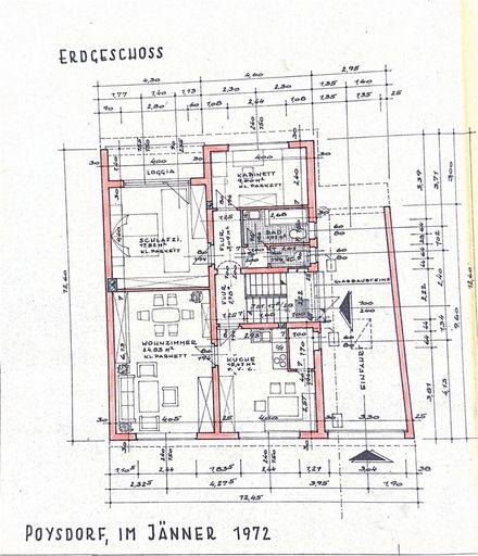 Erdgeschoss - Eingangbereich mit Stiege und Flur, Küche mit Essberreich, Wohnberreich,Schlafzimmer, mit Loggiaa, Wc, Badezimmer, Kabinett