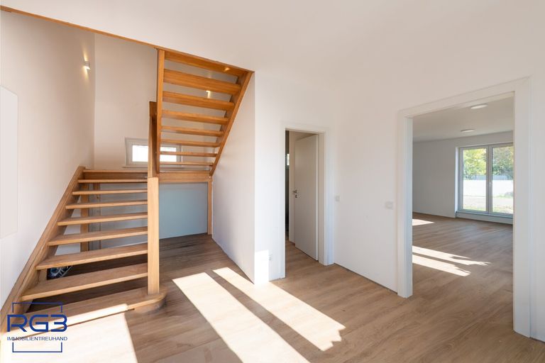 Die Räume sind zentral begehbar, hell und freundlich. Zwei Bäder, zwei Toiletten davon ein Gäste-WC und viel Stauraum machen das Haus auch alltagstauglich für Familien.