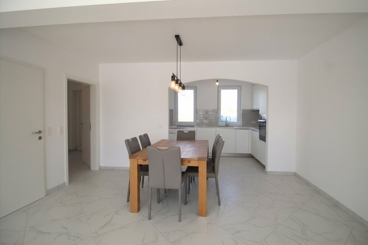 Das Erdgeschoss ist offen gestaltet - offener Küchen-, Ess- und Wohnbereich. Der Technikraum befindet sich im Erdgeschoss beim Eingangsbereich. Drei weitere Zimmer befinden sich im Obergeschoss, wo sich auch das Badezimmer mit Fenster und ein extra WC (auch mit Fenster), befinden.