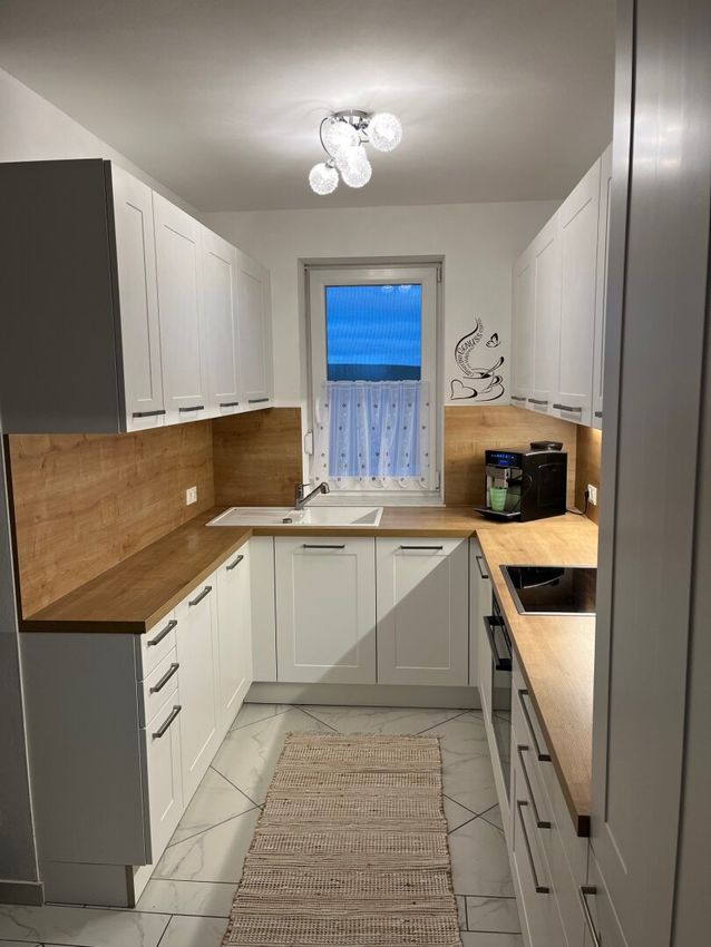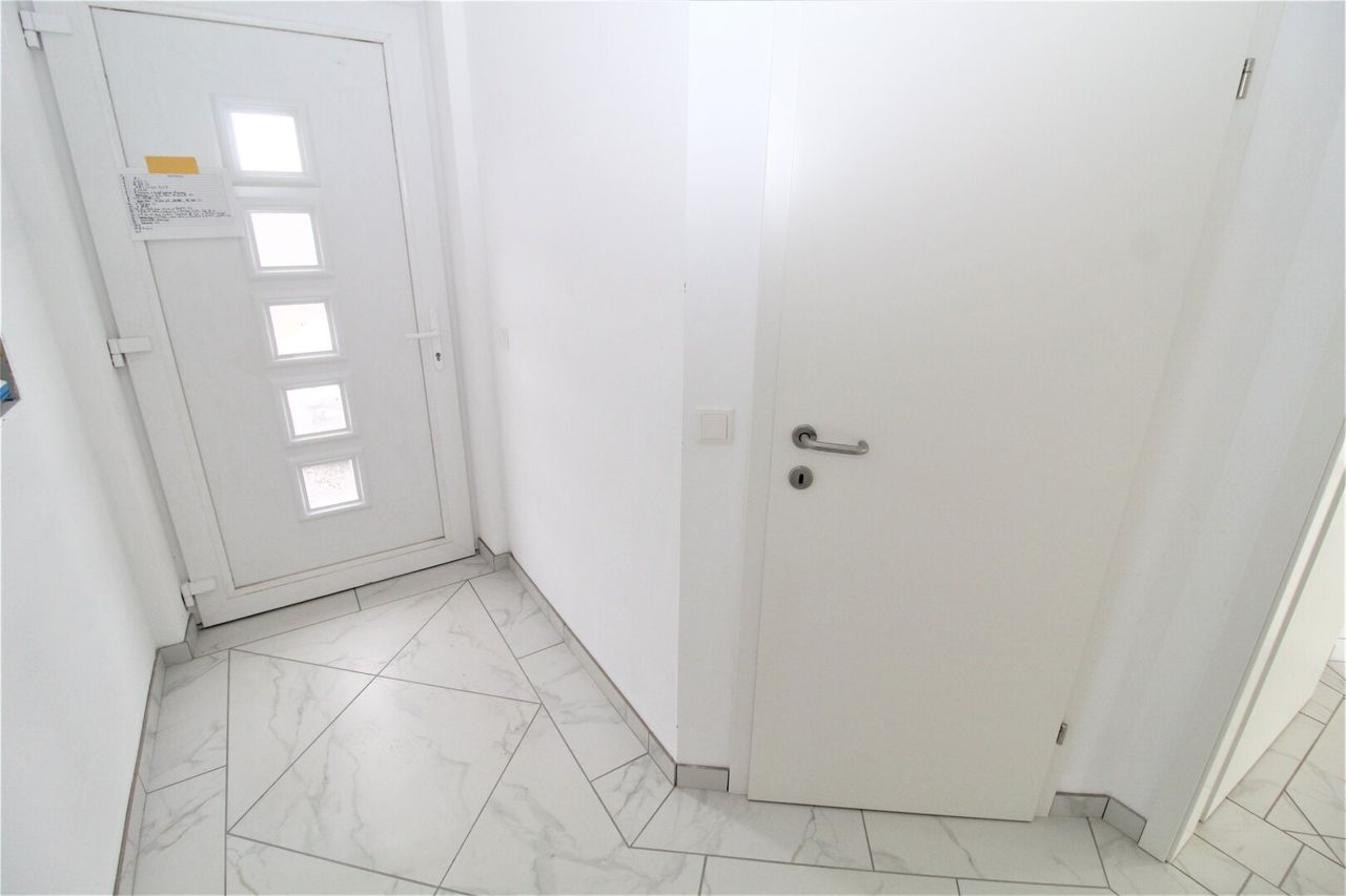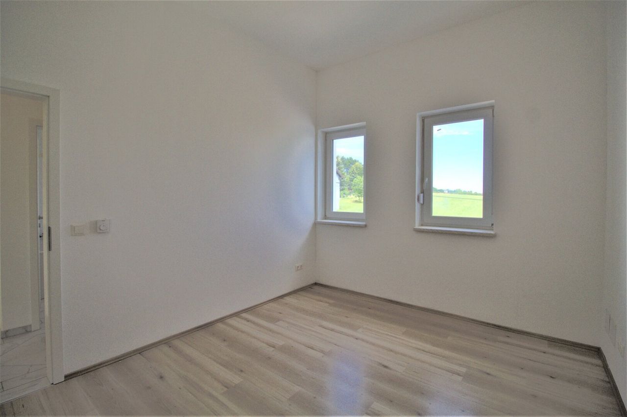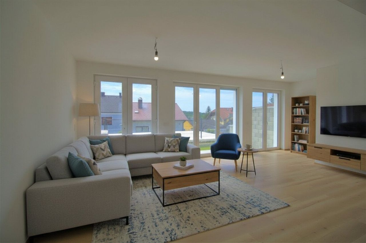 Die Nassräume sind mit, Badewanne, Dusche, Waschbecken, Spiegel- und Unteraschrank und Waschmaschinenanschluss ausgestattet. Am Boden und an den Wänden wurden Steinplatten verlegt. Die Bodenbeläge im Wohnbereich und in den Zimmern sind aus hochwertigem Laminat. Die weißen Innentüren und Türstöcke sind ebenfalls eingebaut.