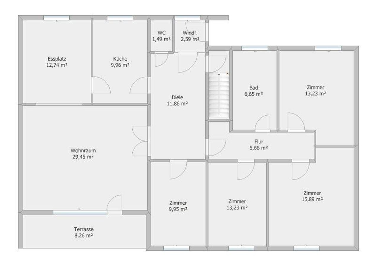 Auf einer Wohnfläche von ca. 130 m² verteilen sich insgesamt 4 Schlafzimmer, ein großzügiges Wohnzimmer mit ca. 30 m², eine Küche mit angrenzendem Esszimmer, ein Badezimmer sowie eine separate Toilette. Die Raumaufteilung eignet sich ideal für Familien oder Paare mit Platzbedarf.