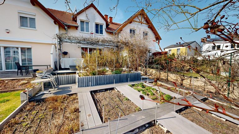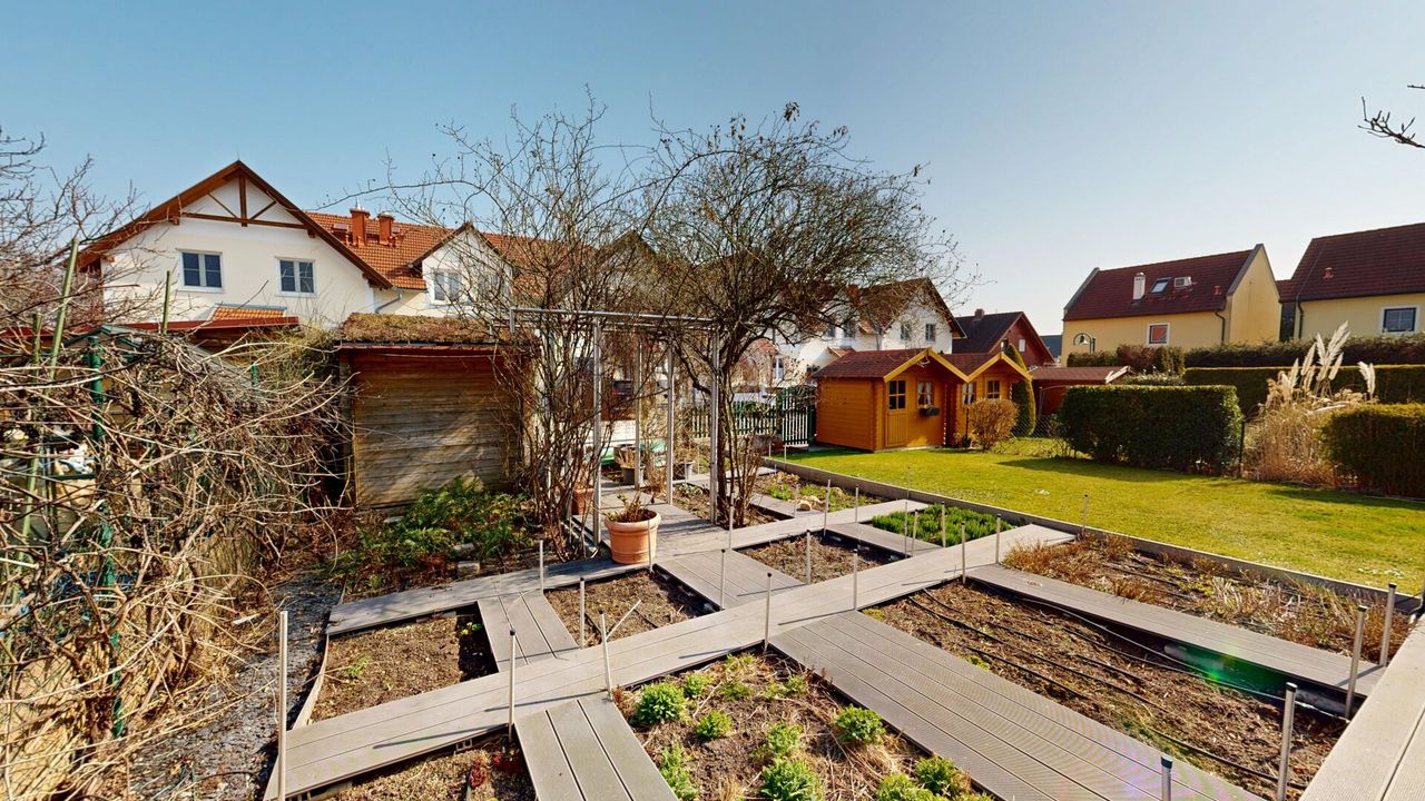 Die gemütliche Terrasse ist vollständig von einer Edelstahl-Pergola überspannt, die mit Wein und Glyzinie bewachsen ist, und schafft einen angenehmen Außenbereich. Ein Salzwasser-Jacuzzi sowie der direkte Zugang in den Garten laden zum Verweilen ein. Der ostseitig ausgerichtete Garten ist klar strukturiert und pflegeleicht angelegt. Er ist in unterschiedlich große, rechteckige Beete unterteilt, die durch Gartenwege aus WPC-Dielen verbunden sind. Jedes Beet verfügt über eine automatische, einzeln schaltbare Bewässerung. Im Zentrum des Gartens befindet sich ein Rosenbogen aus Edelstahl, der dem Außenbereich eine ruhige, private Atmosphäre verleiht. Zwei Gästeparkplätze befinden sich direkt angrenzend.