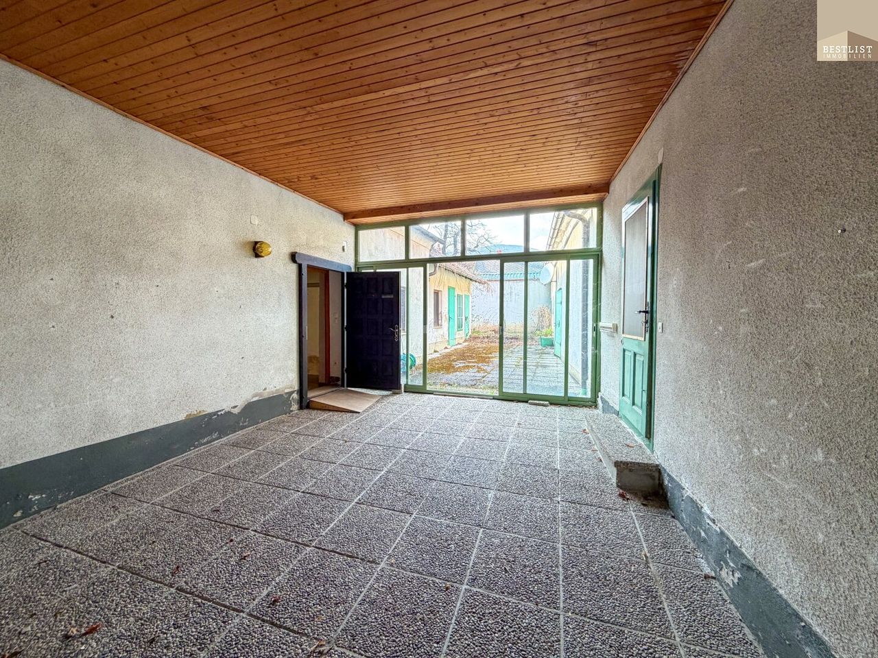 Über den überdachten Einfahrtsbereich gelangt man in den großzügigen Hof. Der linke Flügel beherbergt eine Wohnhälfte mit mehreren Zimmern und einem Badezimmer, der rechte Flügel bietet zusätzlichen Wohnraum. Weiter im Hofbereich befindet sich ein sonniges, kleines grünes Plätzchen – ideal für entspannte Nachmittage.
