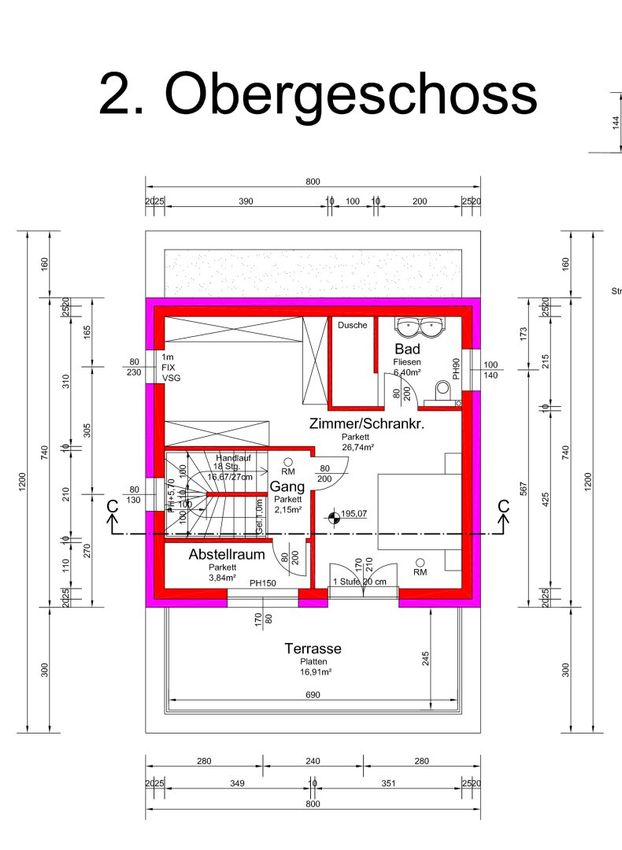 2.OG: 36,81 m²; Terrasse 11,74 m²