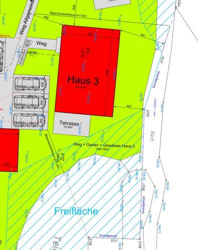 Haus 3 befindet sich in der Mitte des Projektes. Über die gemeinsame Zufahrt gelangen Sie zu den 2 Stellplätzen der Einheit.