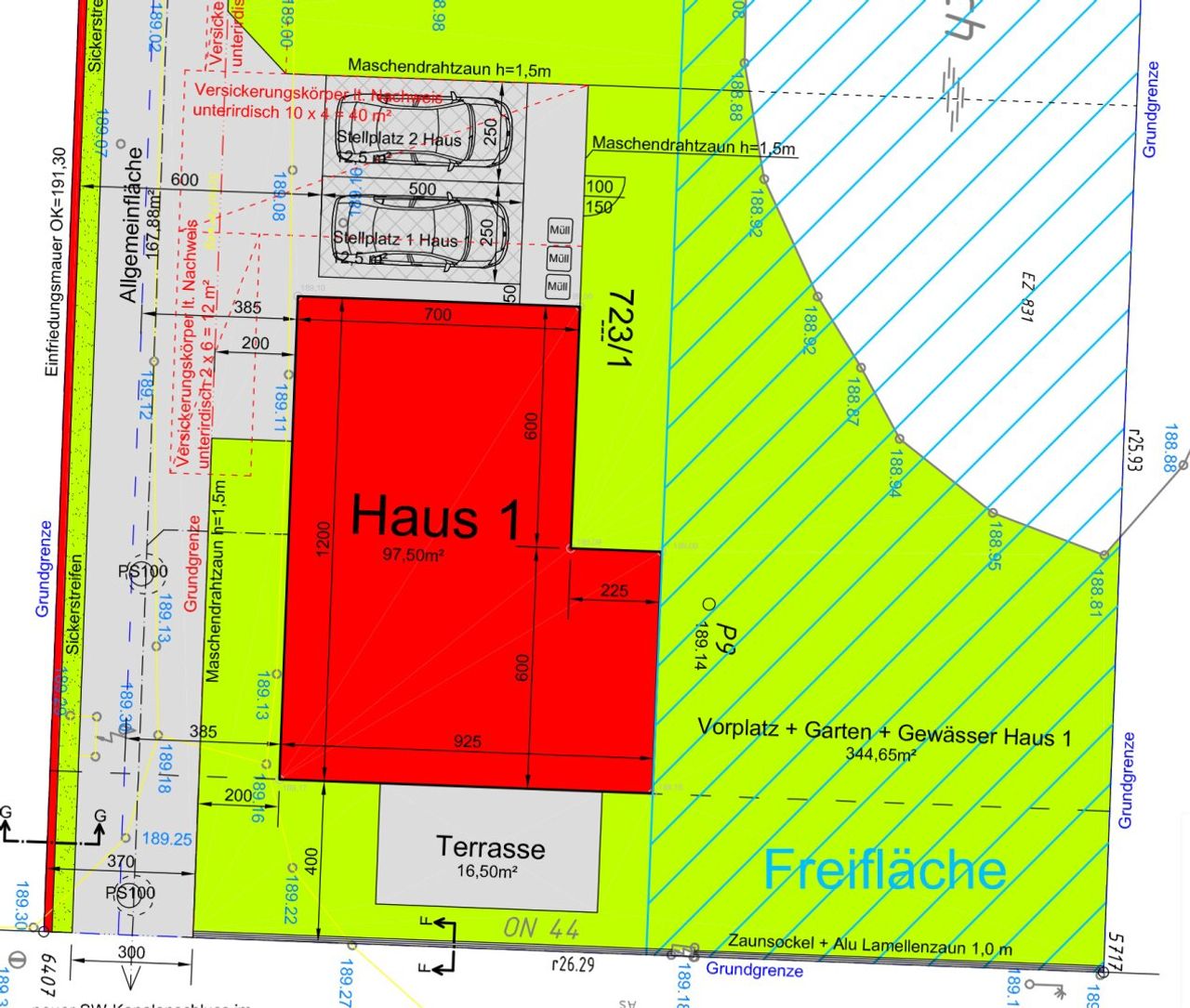 EG: 76,59 m² Wohnfläche; Terrasse 16,5 m²; Garten, Vorplatz und Gewässer: 234,38 m²