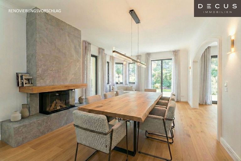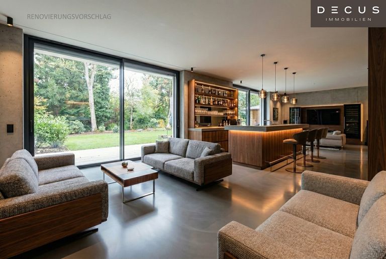 Im Inneren besticht die Villa durch Großzügigkeit, klare Strukturen und eine edle Materialauswahl. Hohe Räume, lichtdurchflutete Fensterflächen und geschmackvolle Ausstattungsdetails schaffen eine Atmosphäre von Komfort und Exklusivität. Jede Ebene zeigt eine durchdachte Raumgestaltung, die sowohl Rückzugsmöglichkeiten als auch repräsentative Bereiche für Gäste und Feste bietet.