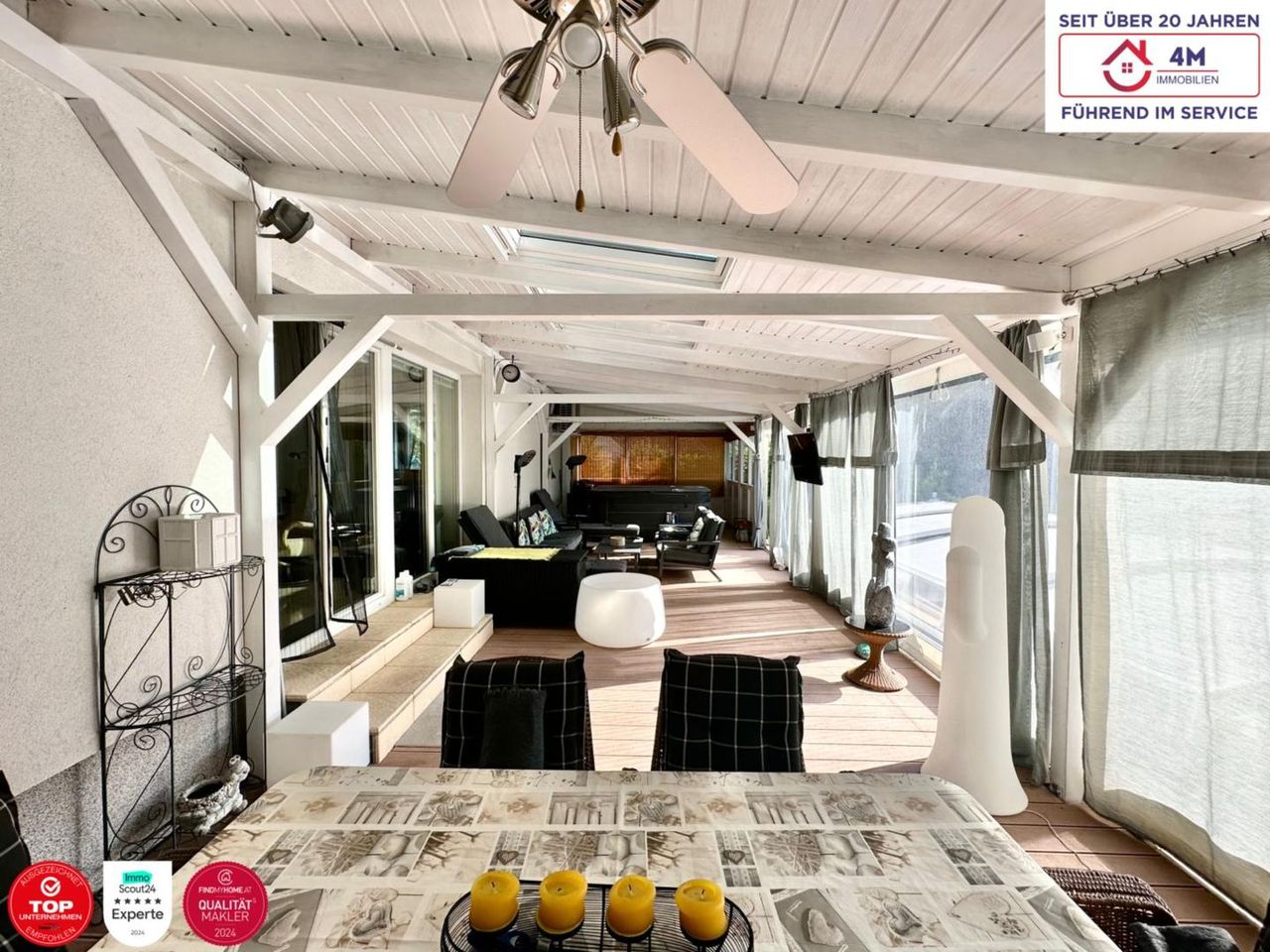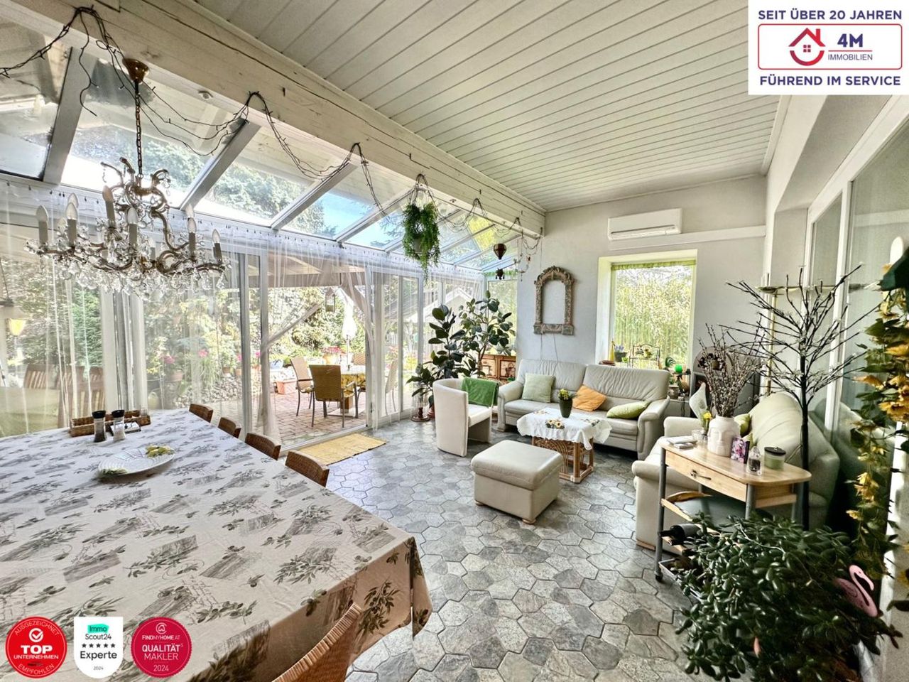 Direkt neben der Terrasse befindet sich eine Grillhüte mit Blick in den Park-ähnlichen Garten sowie ein kleines Biotop. Neben dem Esszimmer befindet sich ein weiterer Bereich der als zweites kleines Wohnzimmer oder auch als Büro geeignet wäre. Von diesem Raum aus gelangt man auf den zweiten Wintergarten mit Zugang zu einem uneinsehbaren beheiztem und selbstreinigenden Pool mit Überdachung sowie einen Whirlpool für 6 Personen.