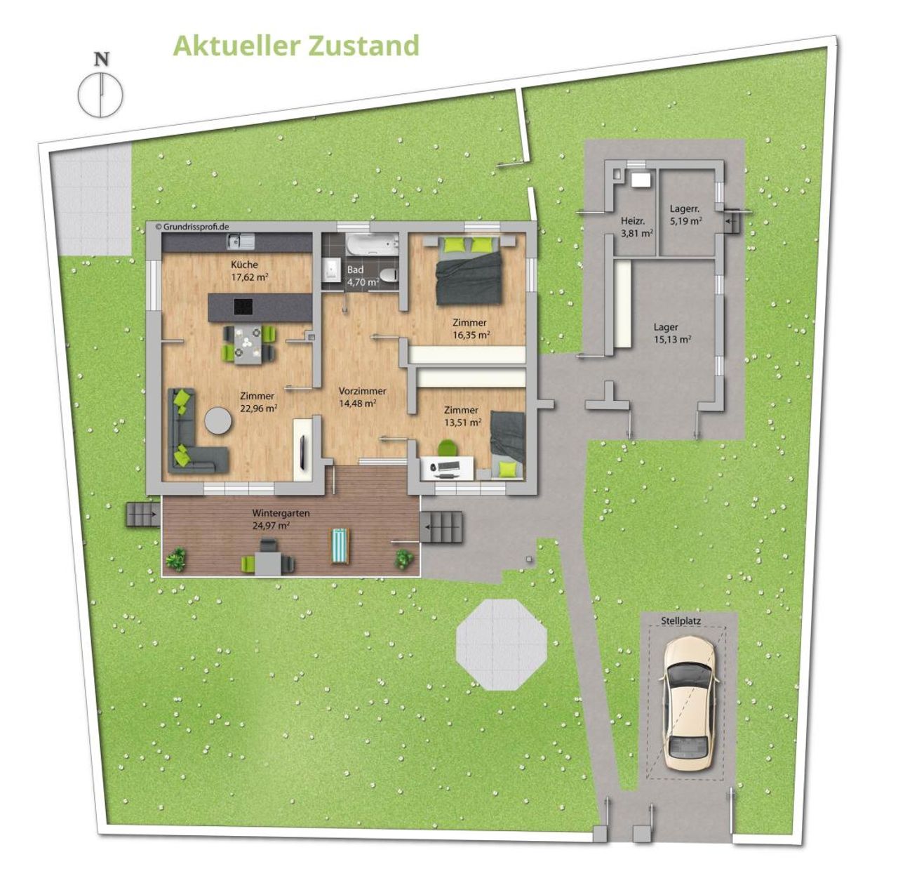 - Objekttyp: Massivbau-Bungalow (Baujahr 1965) auf einem ca. 600 m² großen, ebenen Sonnengrundstück.