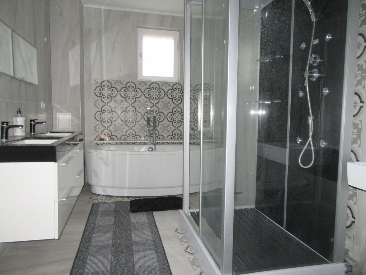 Badezimmer mit Doppelwaschtisch, Badewanne und Dusche, separates WC,