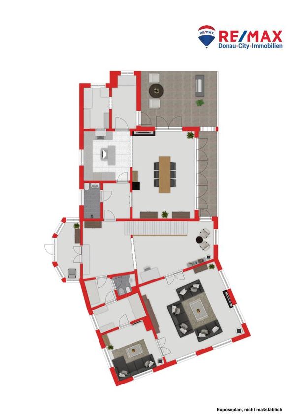 Zu einer Seite erreichen Sie das Speisezimmer mit ca. 25m². Von hier aus haben Sie einen unvergleichlichen Ausblick und Ausgang auf die geräumige Terrasse.