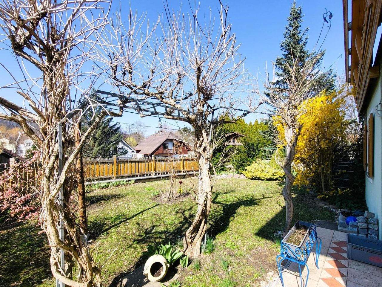 GARTEN: Ein großzügiger, gegen Südwesten ausgerichteter Vorgarten mit buntem Pflanzen- und Strauchbestand, sowie der gegen Nordosten liegende, ebene Garten mit massiver Stützmauer im oberen Hangbereich.