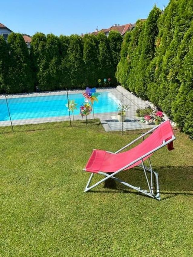 moderner Baustil, neuwertige Einbauküche, Kamin, Klima, Außenjalousien, Fliegengitter, Garage sowie Stellplatz davor, Balkon, eigener Pool mit Wärmepumpe, südseitige Terrasse, Garten, Wärmeschutzfassade, Energieausweis HWB -Klasse B, usw.