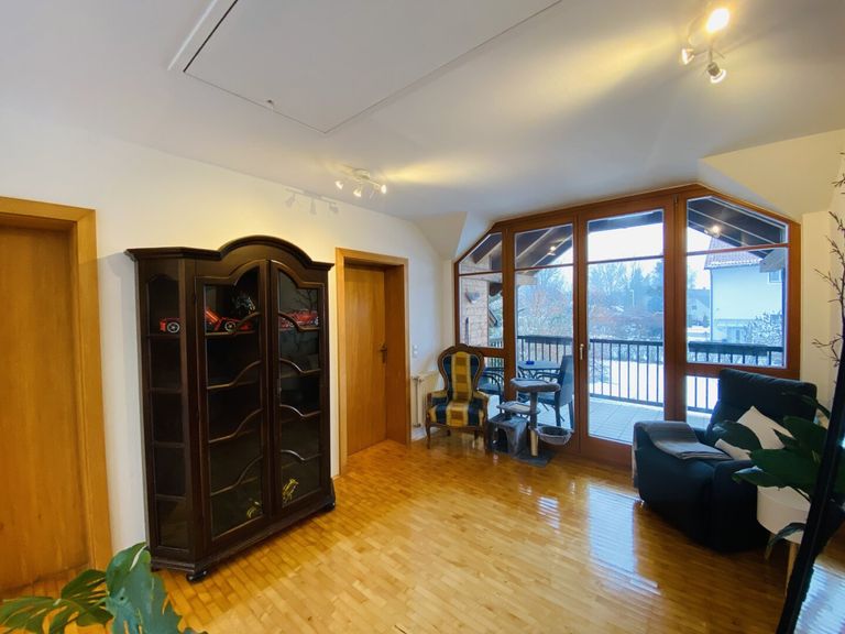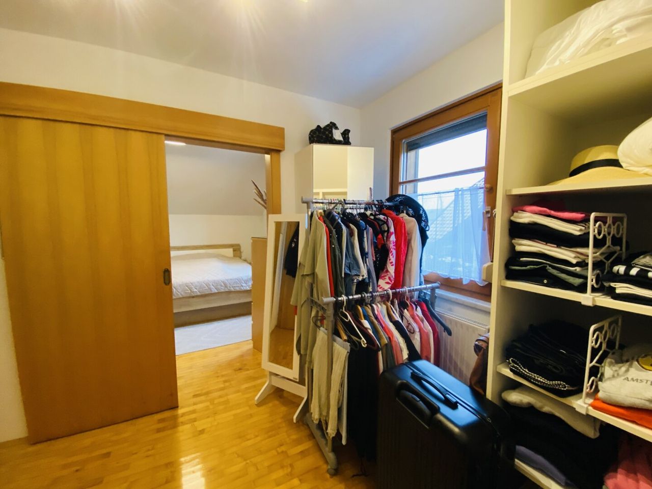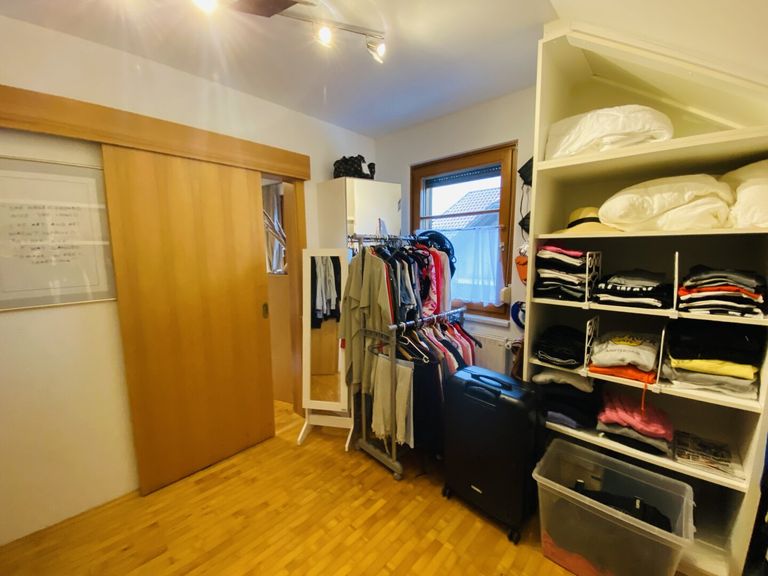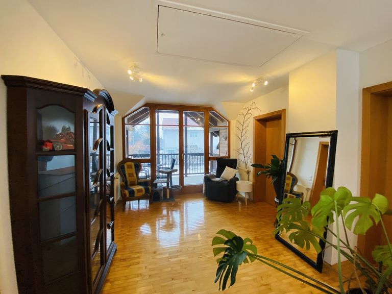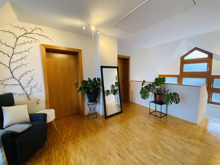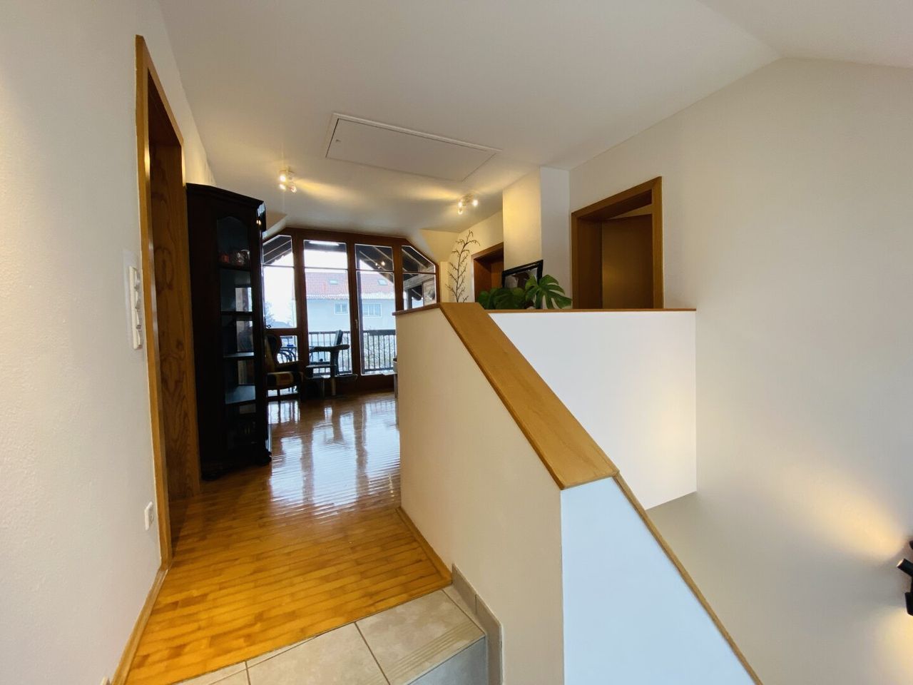 Das Obergeschoss empfängt Sie mit einer großzügigen Galerie und Zugang zu einem Balkon. Es stehen vier Zimmer zur Verfügung: ein geräumiges Schlafzimmer mit angrenzendem begehbarem Kleiderzimmer, ein Kinderzimmer sowie ein Badezimmer mit Badewanne, WC, Waschbecken und Fenster.