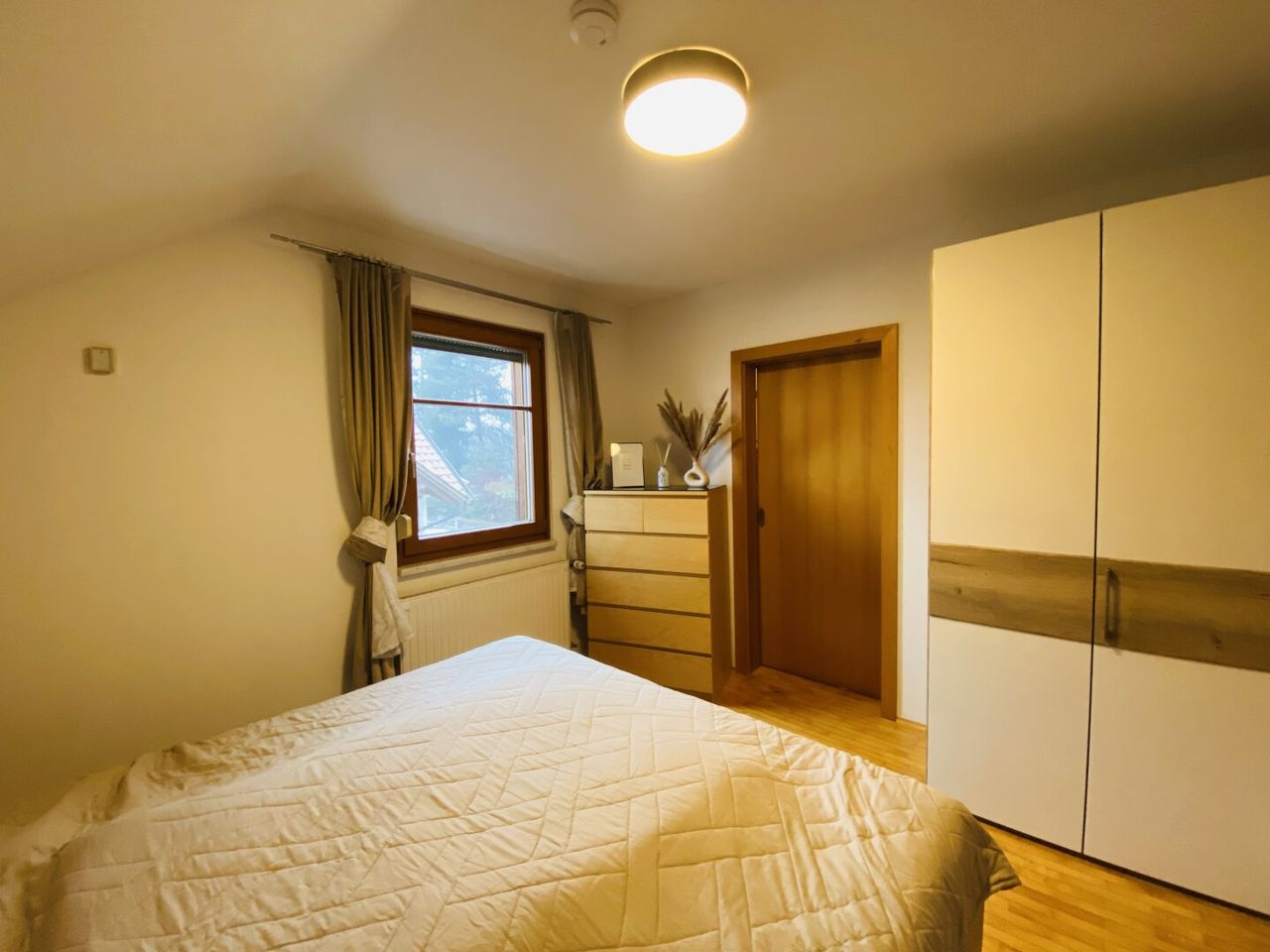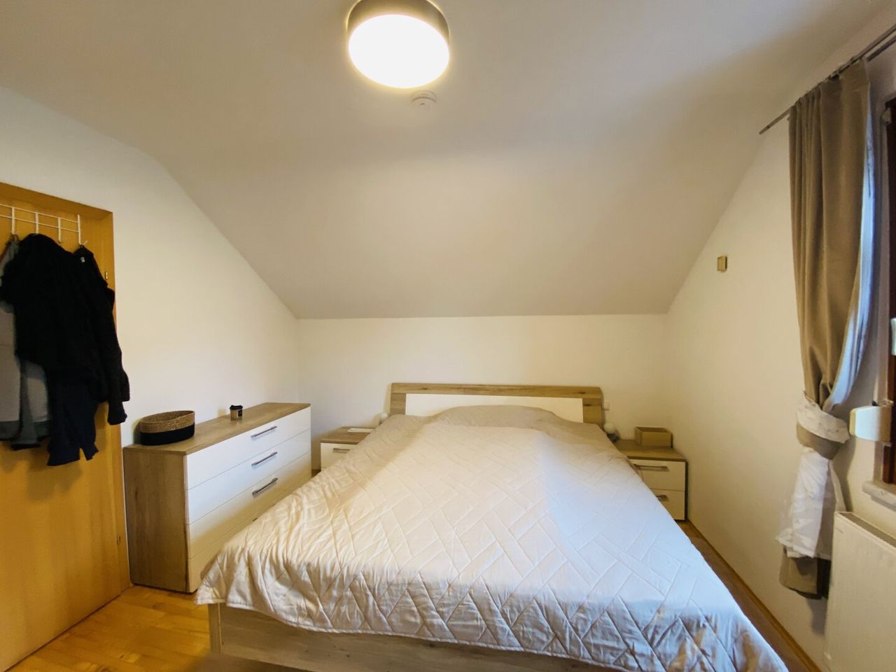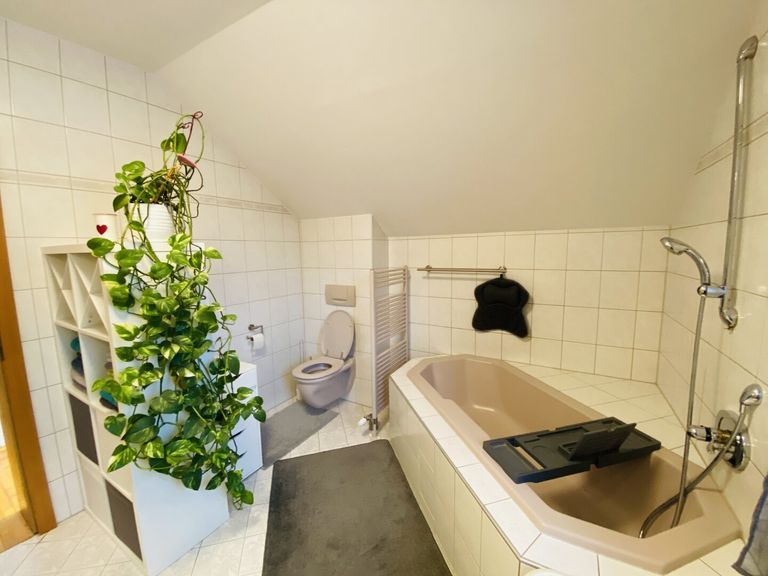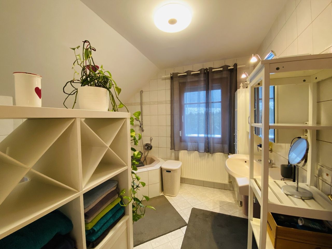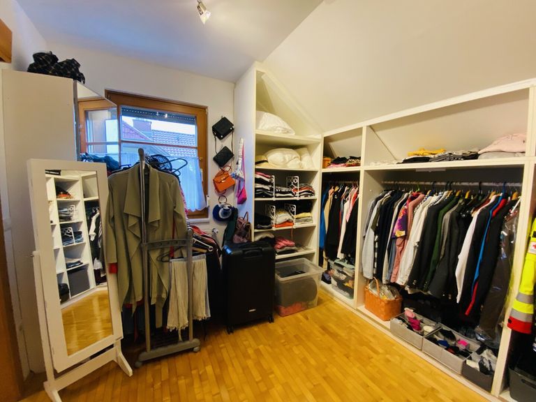 Das Obergeschoss empfängt Sie mit einer großzügigen Galerie und Zugang zu einem Balkon. Es stehen vier Zimmer zur Verfügung: ein geräumiges Schlafzimmer mit angrenzendem begehbarem Kleiderzimmer, ein Kinderzimmer sowie ein Badezimmer mit Badewanne, WC, Waschbecken und Fenster.
