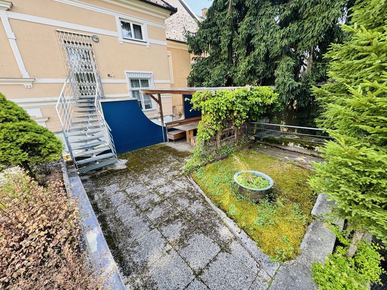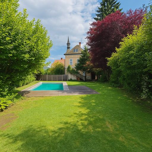 Das Grundstück ist ein echtes Refugium mitten in der Stadt – fast uneinsehbar, herrlich ruhig und mit viel gewachsenem Grün. Ein alter Baumbestand sorgt für natürlichen Schatten, während Rasenflächen und die großzügige Poolanlage (4 × 8 m) zum Verweilen einladen.