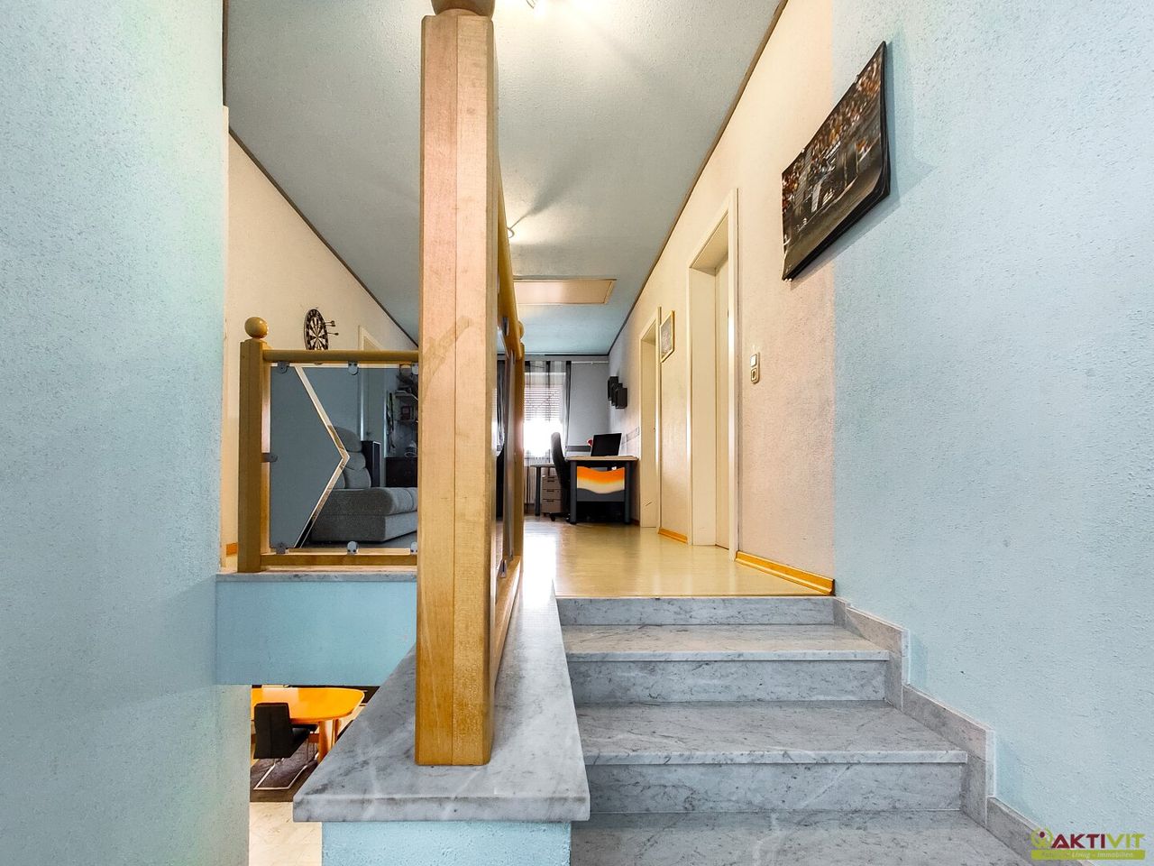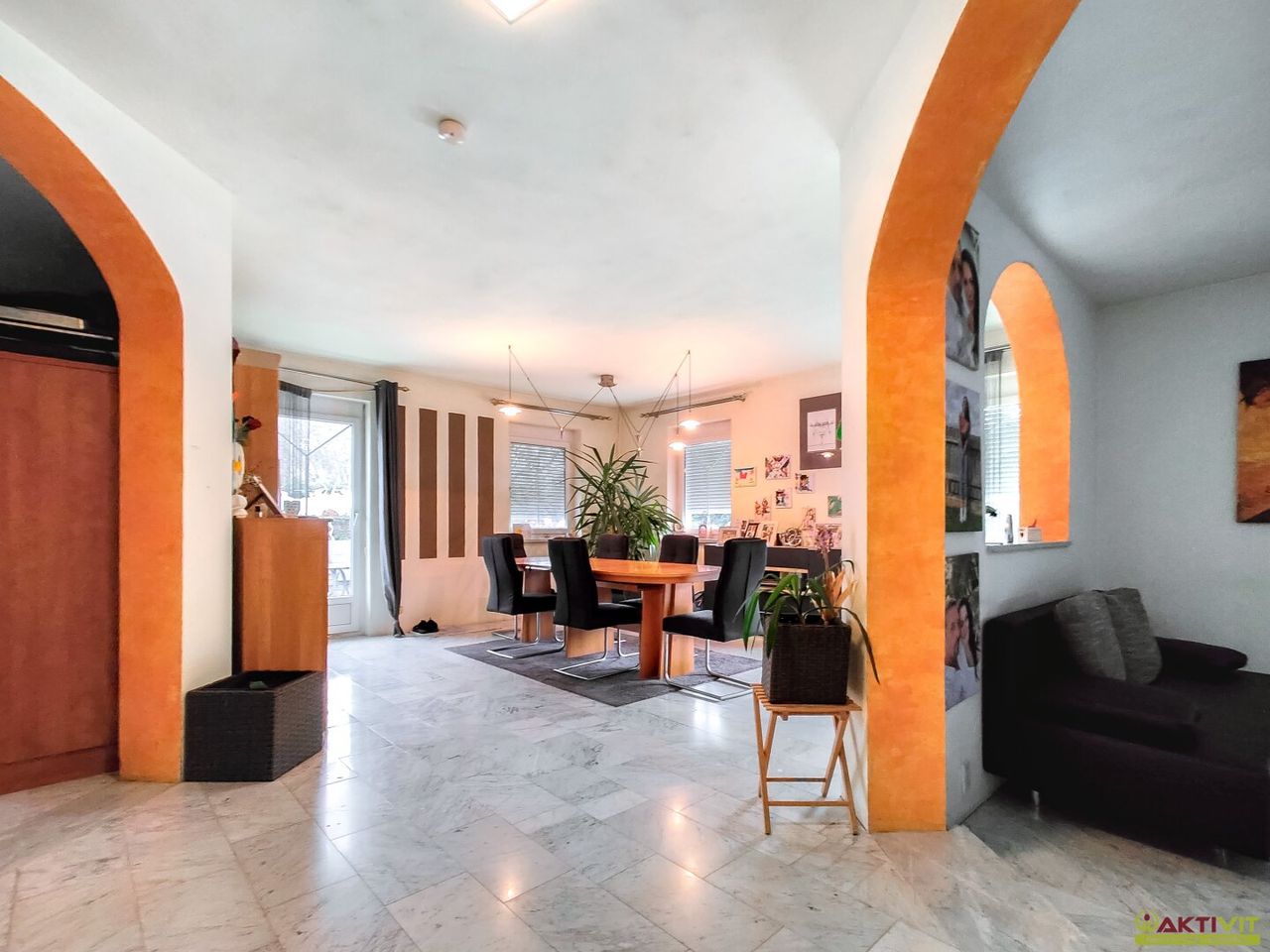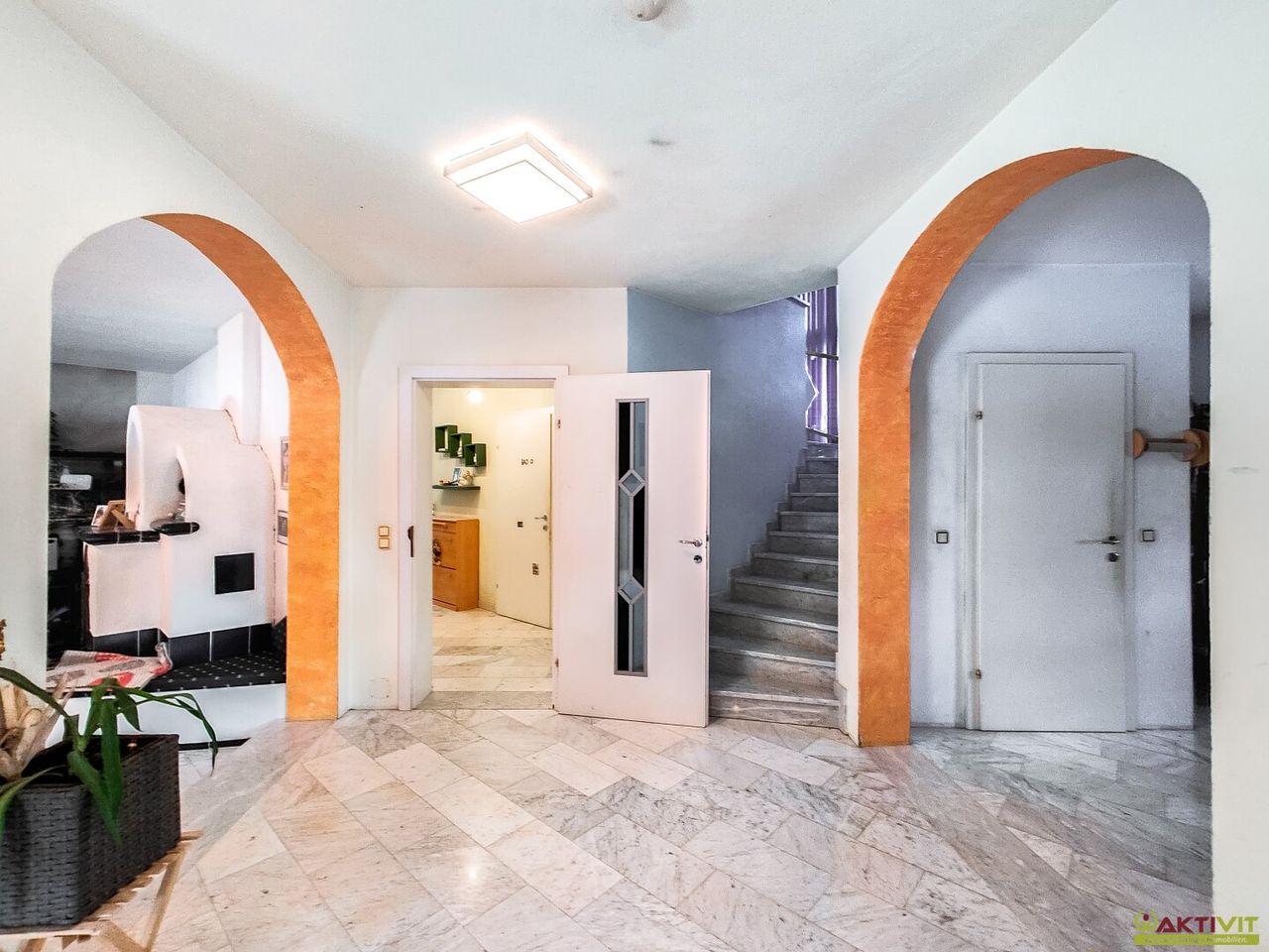 Das Wohnhaus befindet sich in gepflegtem Zustand, kleinere Renovierungsmaßnahmen wie das Streichen der Fassade und Innentüren sowie das Verlegen fehlender Fliesen im Keller sind noch durchzuführen. Die Liegenschaft wurde in Massivbauweise errichtet und verfügt über eine solide Ausstattung. Der Bodenbelag besteht aus Fliesen, Laminat und Marmor.