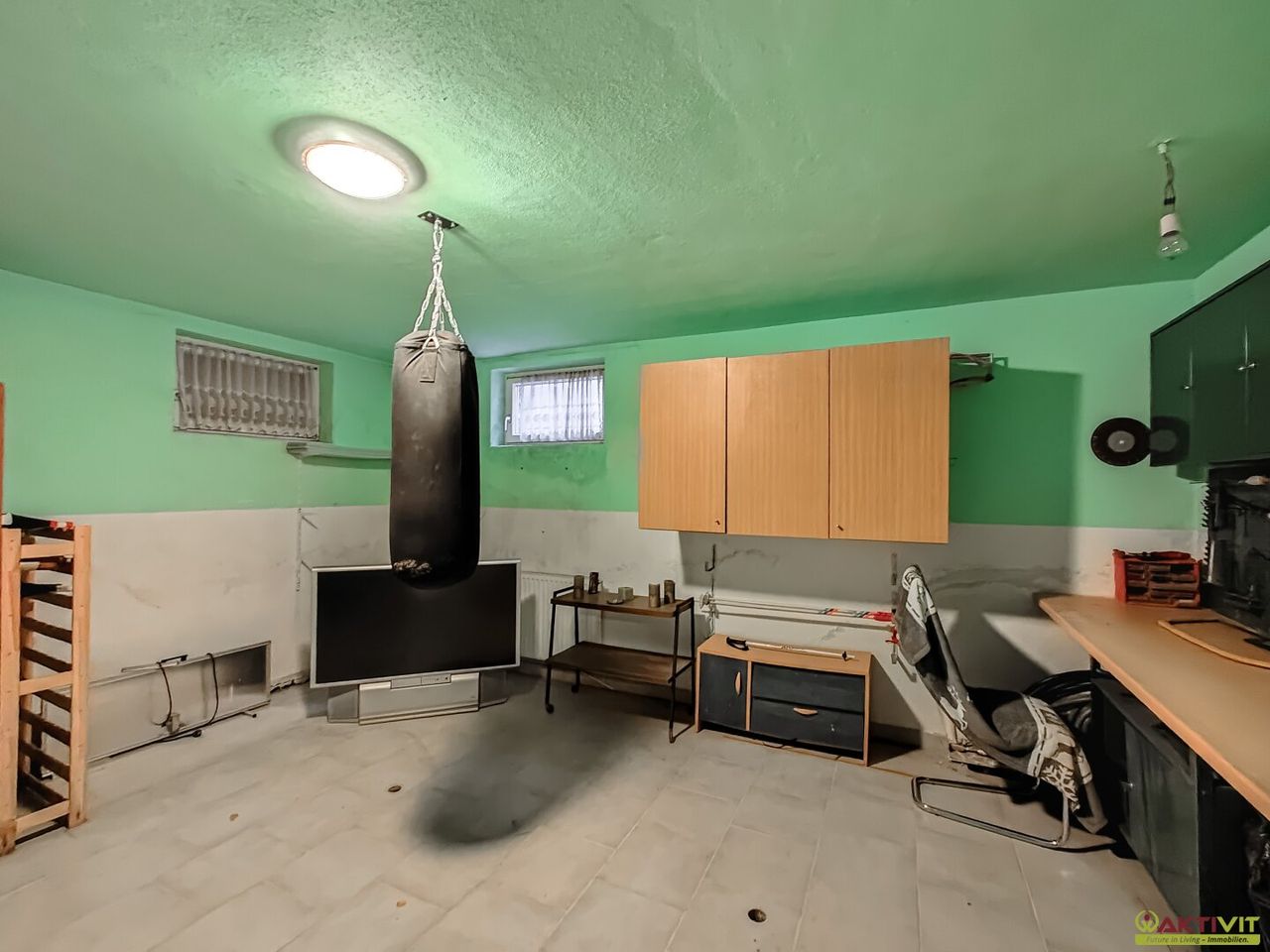 Die verbleibende Nutzfläche verteilt sich auf den Keller mit ca. 92 m² (welcher neu verfliest werden muss), der drei Lagerräume, einen Heizraum und einen Tankraum umfasst. Zusätzlich gehört eine Garage mit ca. 36 m² zur Liegenschaft, die ausreichend Platz für ein Fahrzeug und Stauraum bietet.